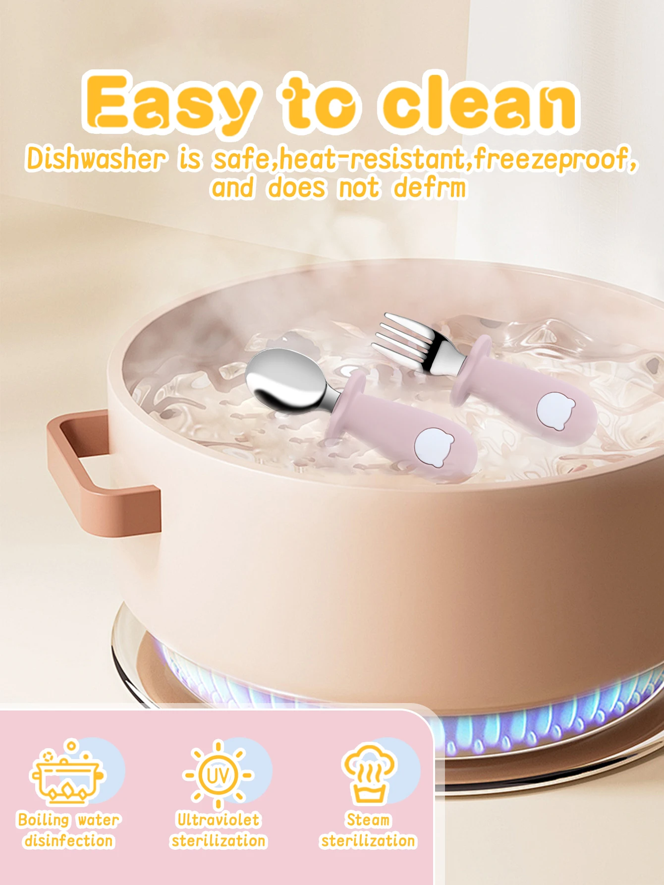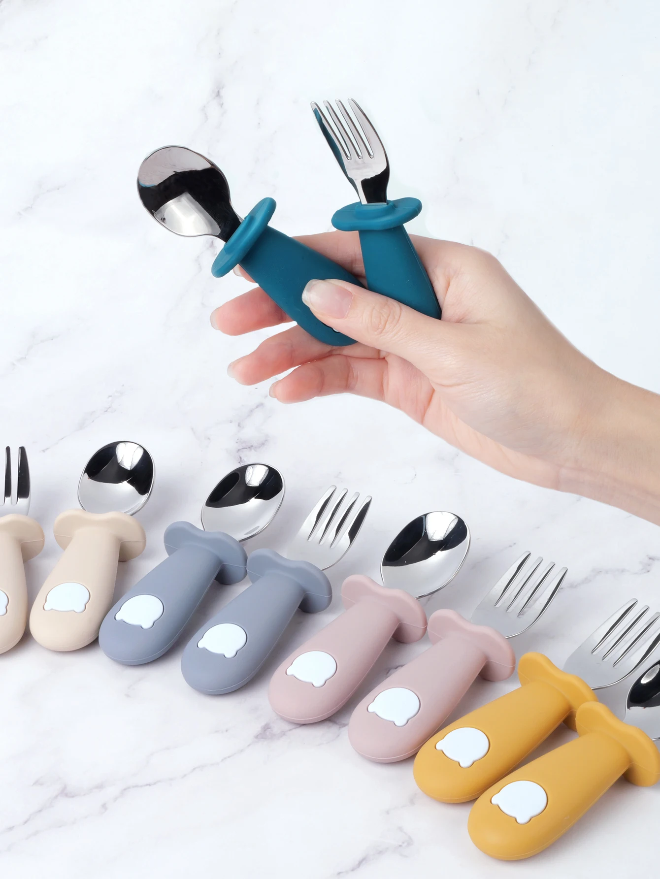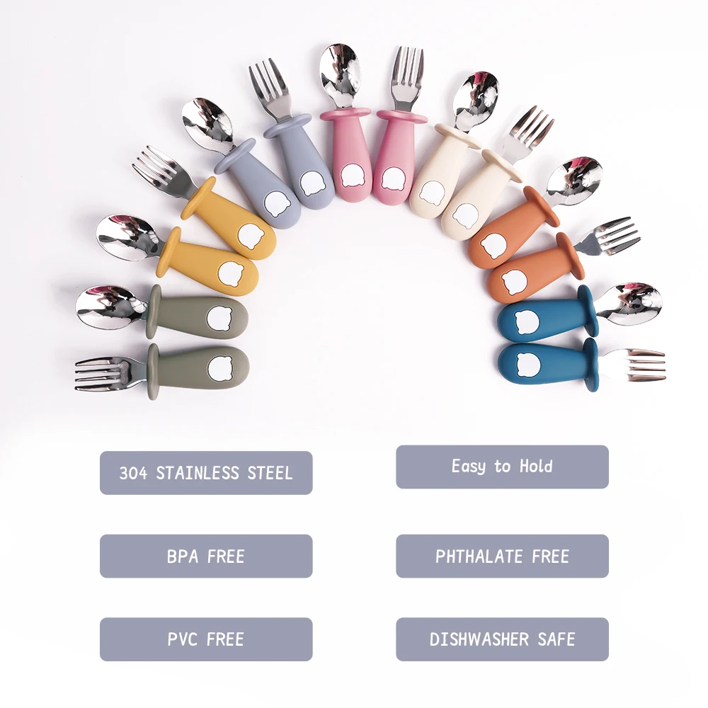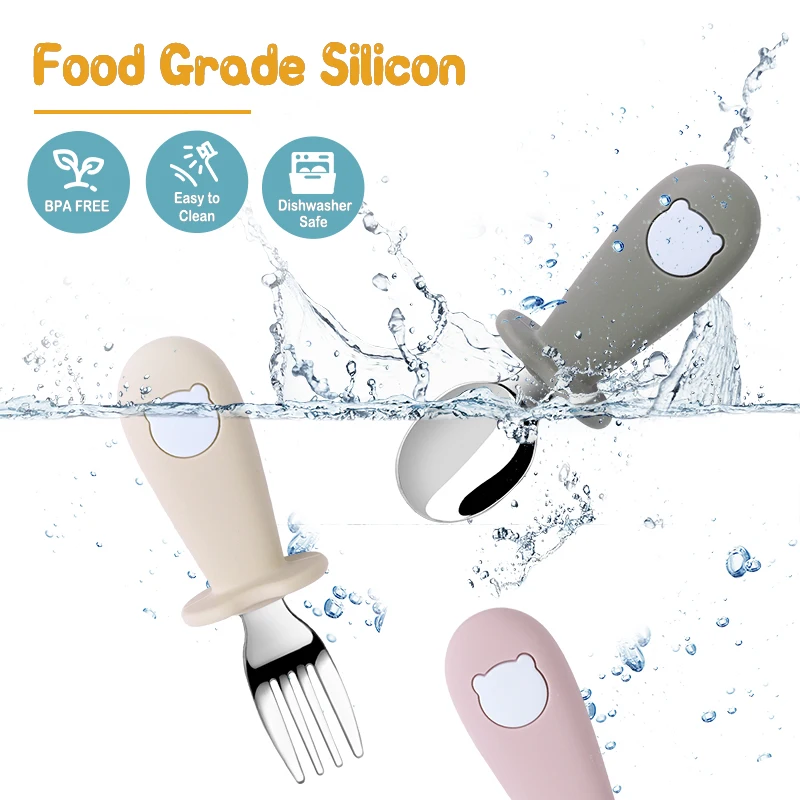 Baby Feeding Solid Food Spoon Fork Set BPA Free Silicone Handle Cartoon Bear Stainless Utensil Children's Tableware