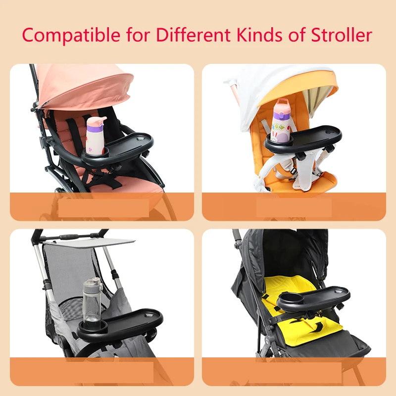 La bandeja para niños se adhiere fácilmente al marco del cochecito y cuenta con un soporte de bebidas para niños designado y una superficie plana para bocadillos u otros artículos. Se puede liberar cualquier lado para mover individualmente la bandeja fuera del camino al cargar y descargar al niño.