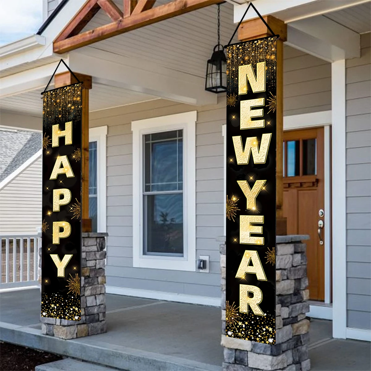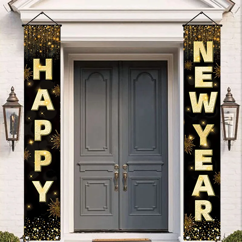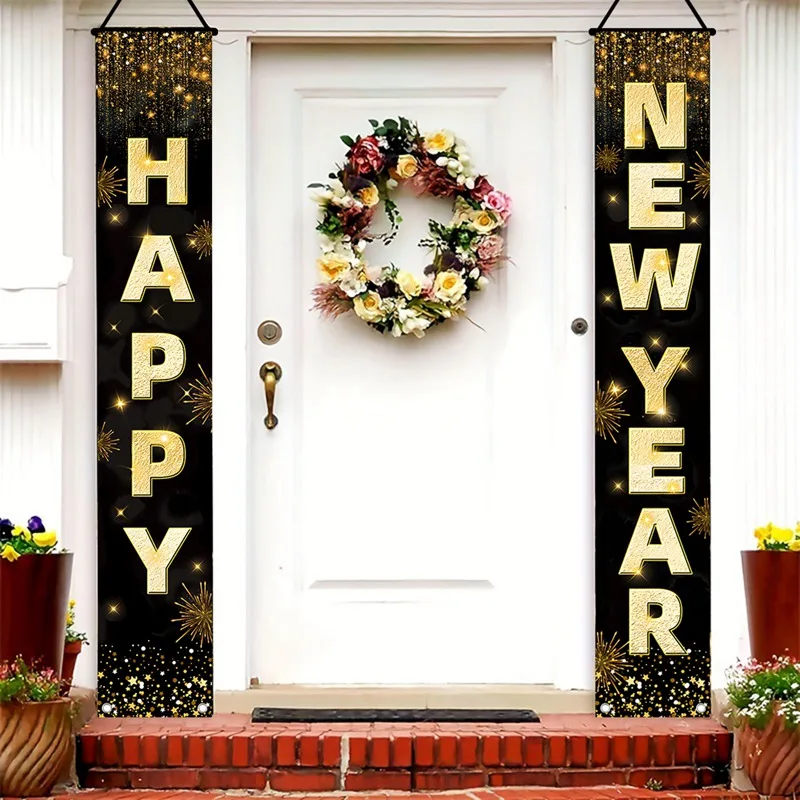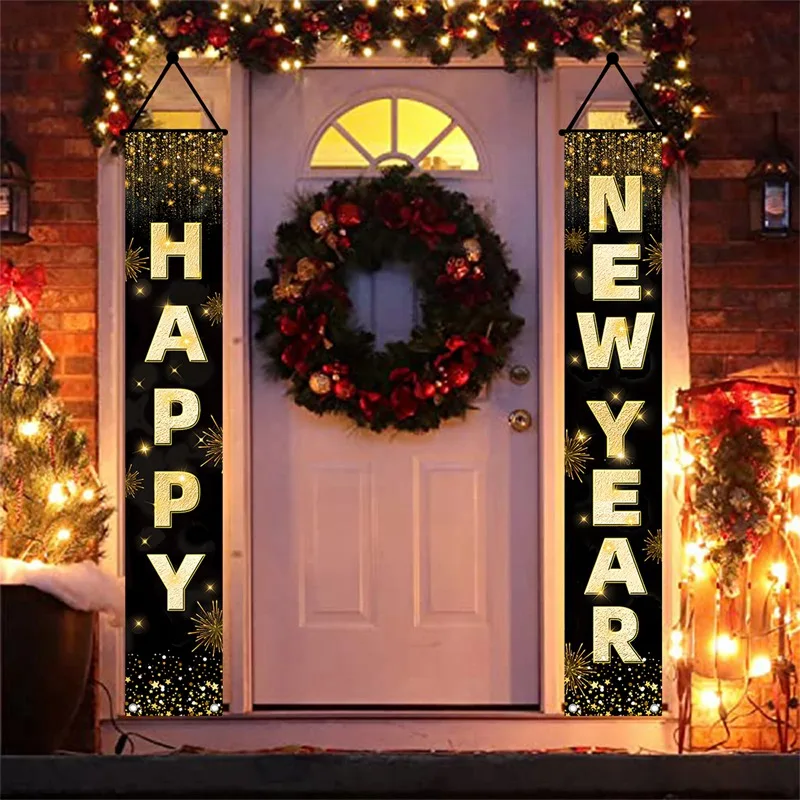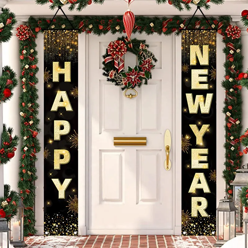 Bandera colgante de Feliz Año Nuevo, cartel de puerta de porche, decoración de año nuevo para el hogar, colgante de puerta de oro negro, decoración de Año Nuevo 2024, 2025