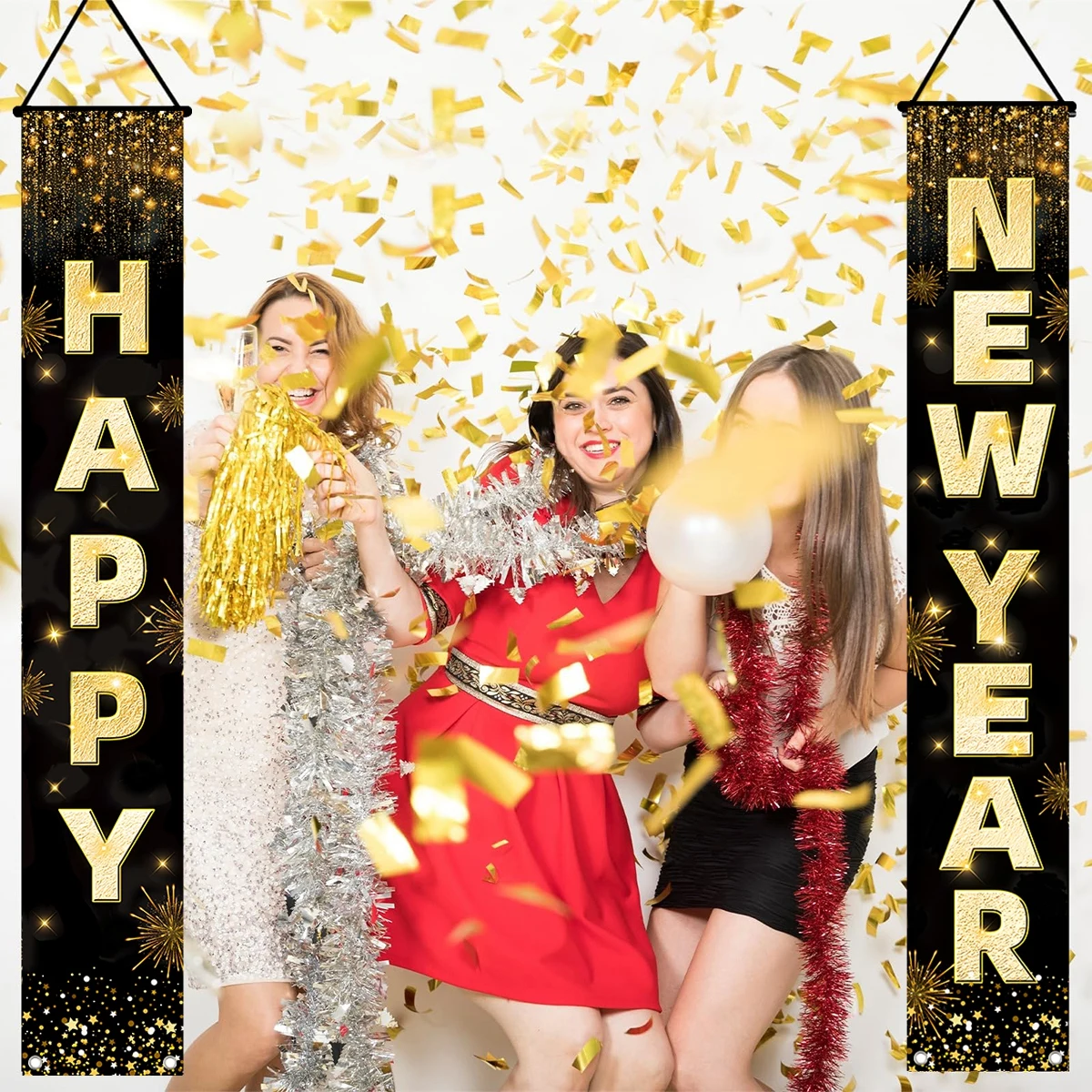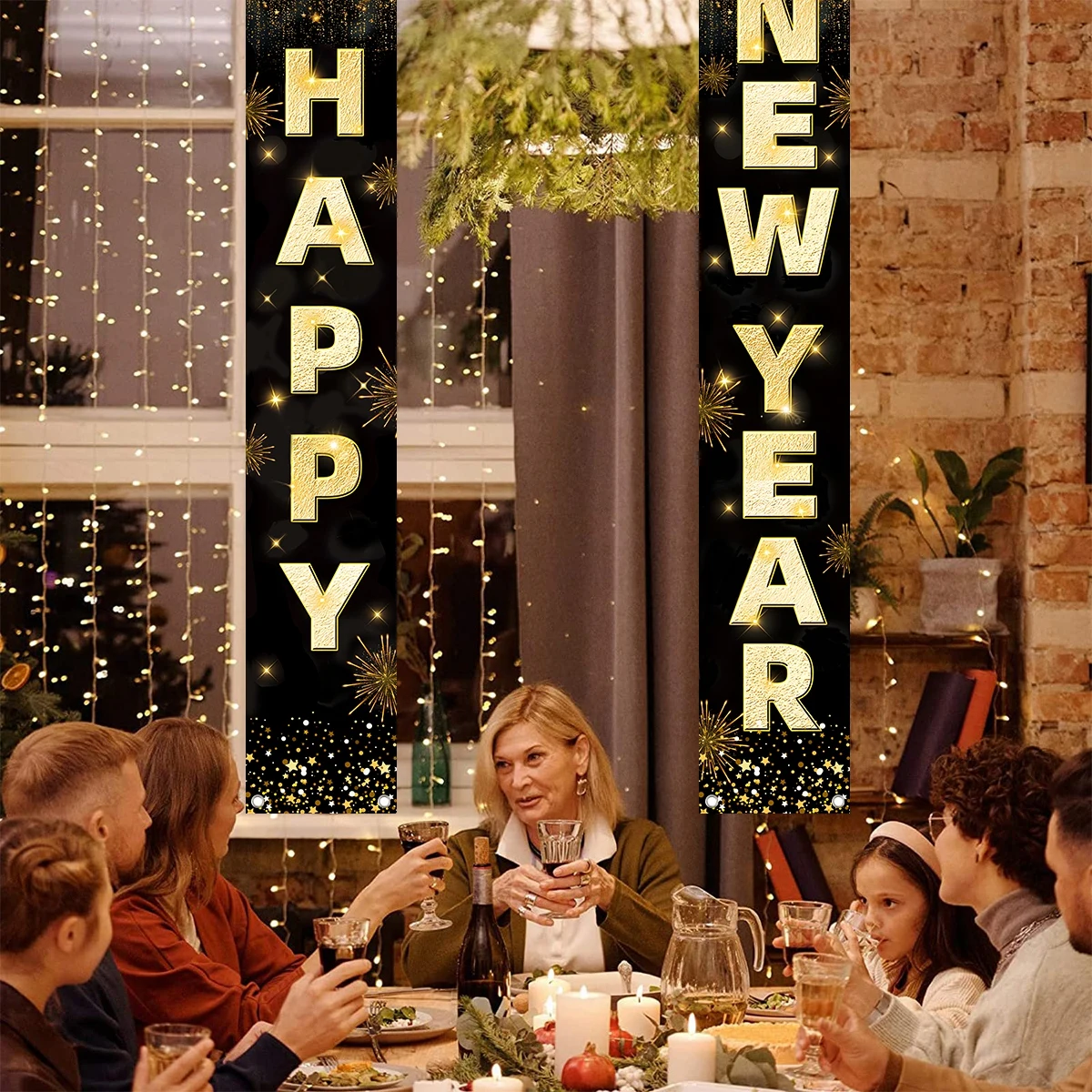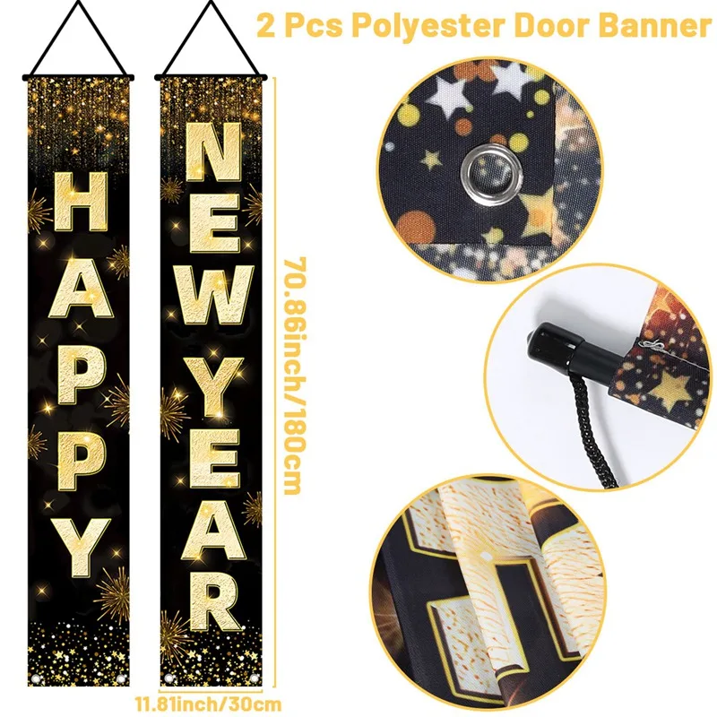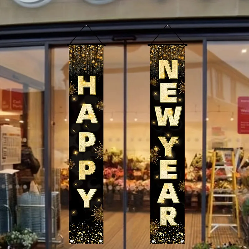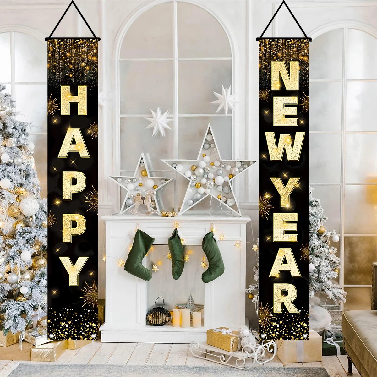 Bandera colgante de Feliz Año Nuevo, cartel de puerta de porche, decoración de año nuevo para el hogar, colgante de puerta de oro negro, decoración de Año Nuevo 2024, 2025