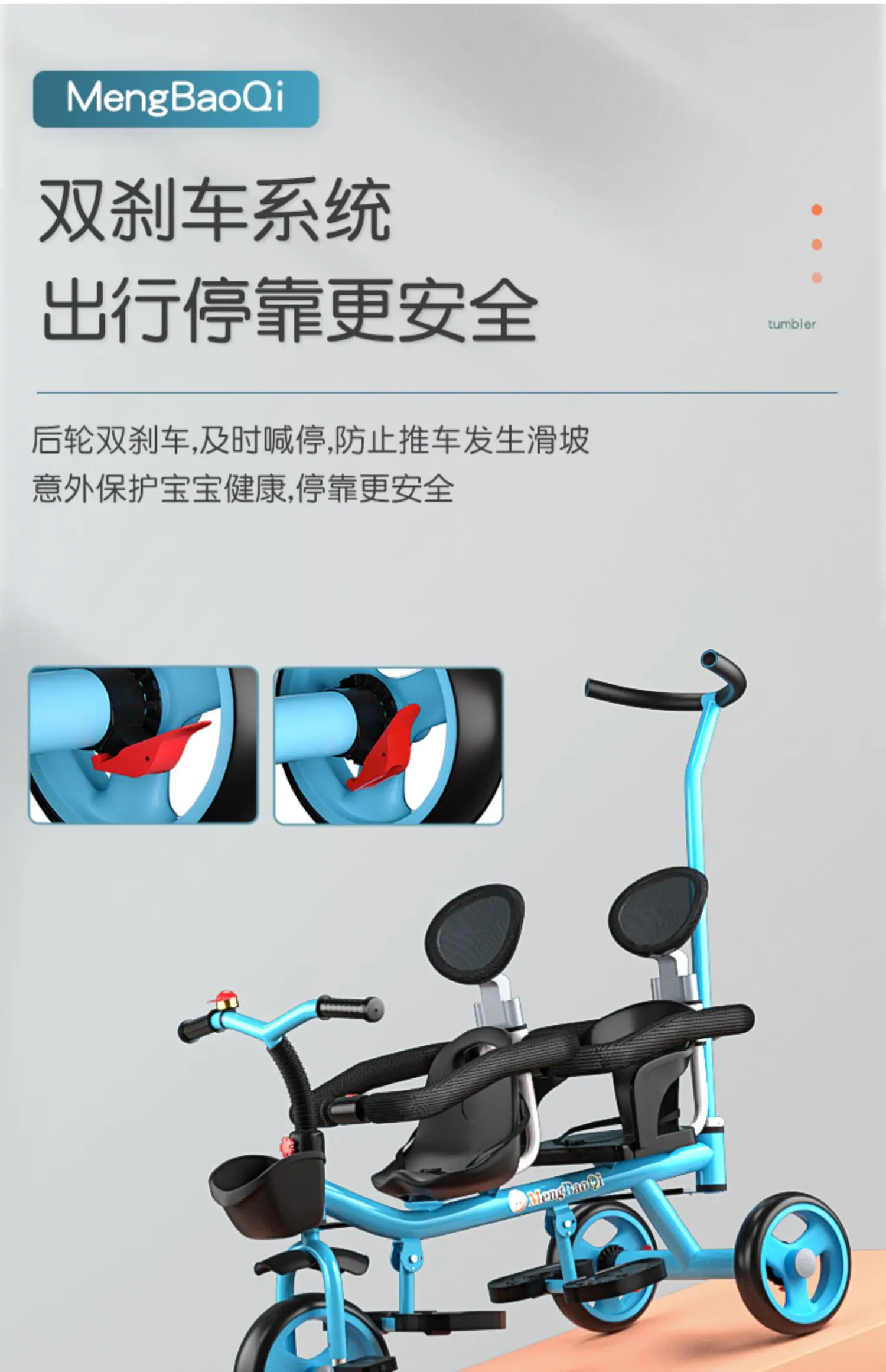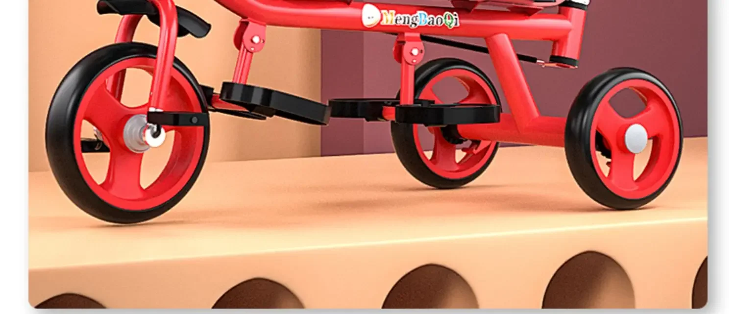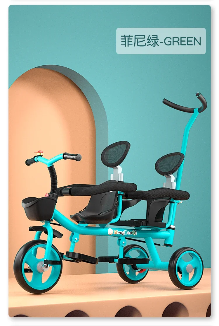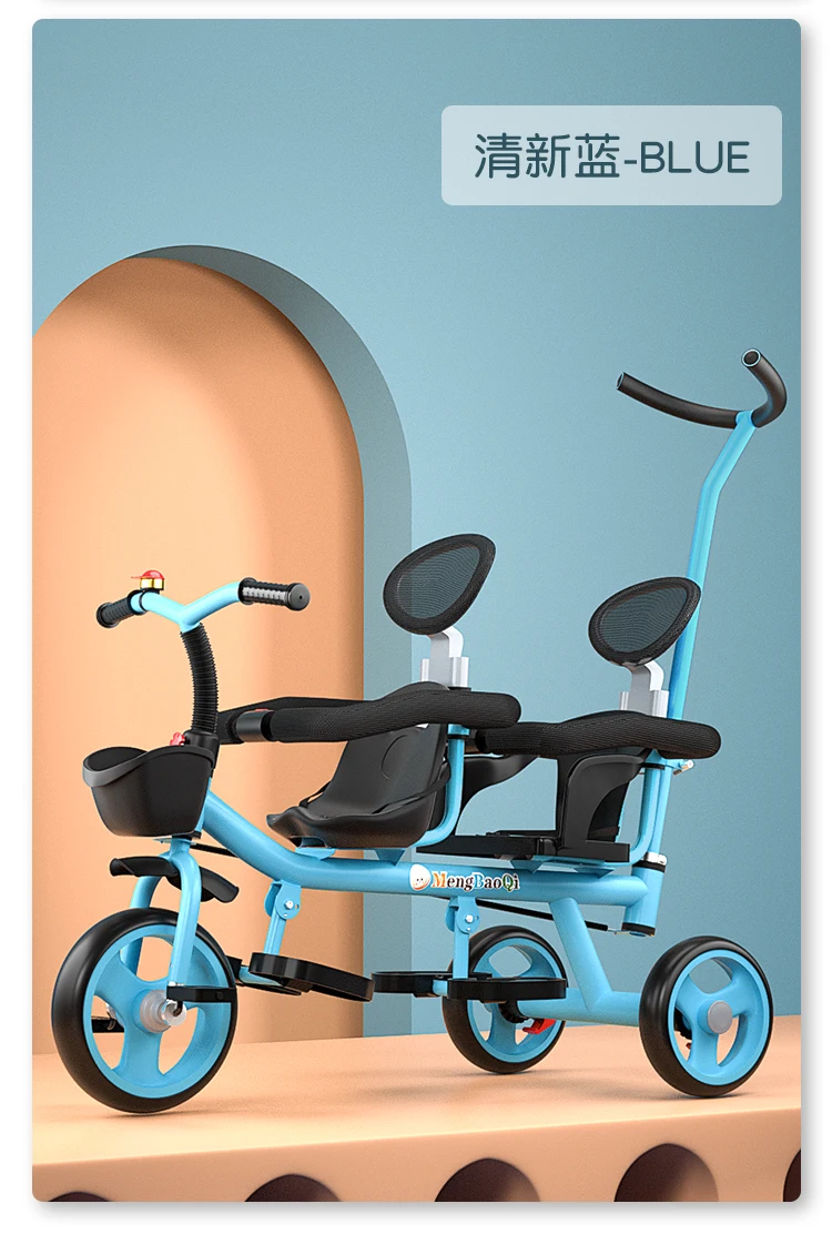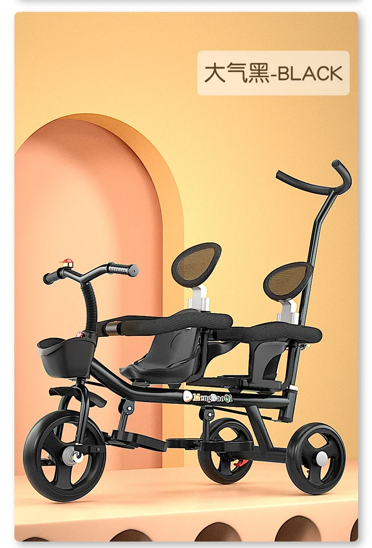 Barandilla de seguridad para triciclo para niños gemelos, freno trasero antideslizante, asiento desmontable, diseño plegable para viajes en centro comercial con portabebés doble