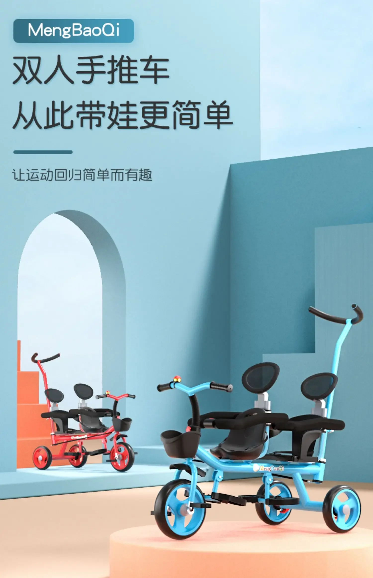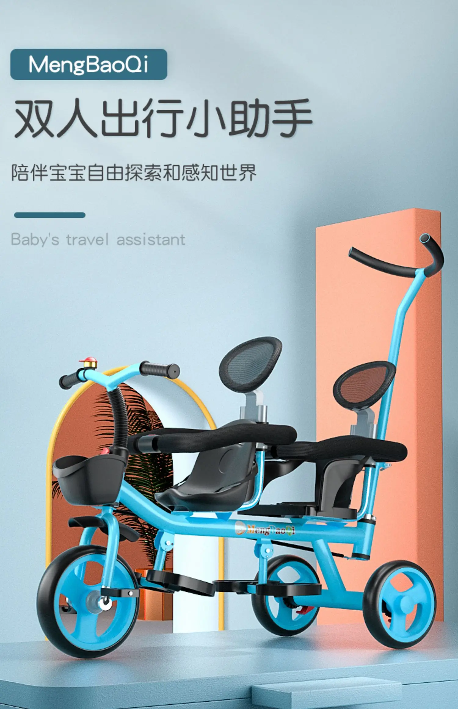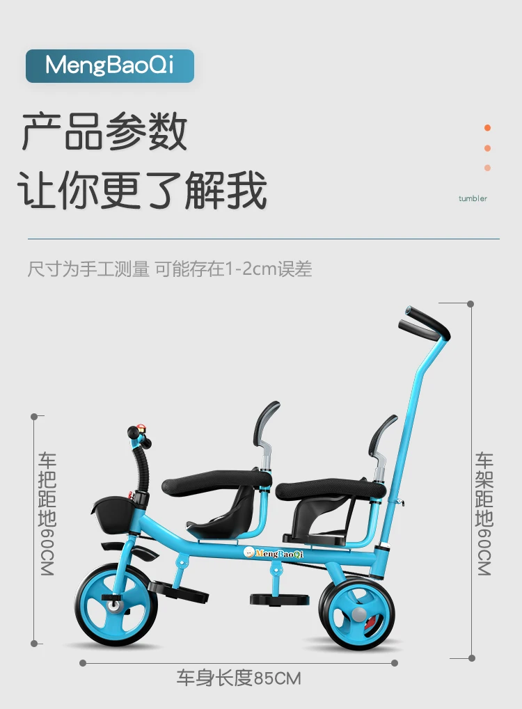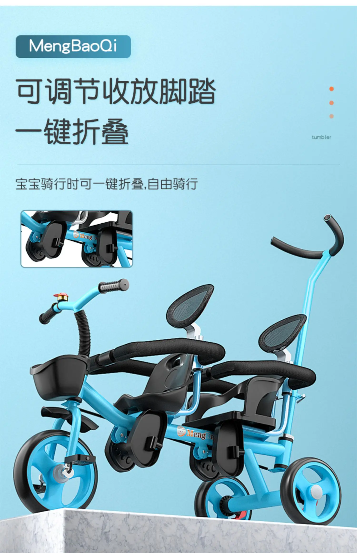 Barandilla de seguridad para triciclo para niños gemelos, freno trasero antideslizante, asiento desmontable, diseño plegable para viajes en centro comercial con portabebés doble