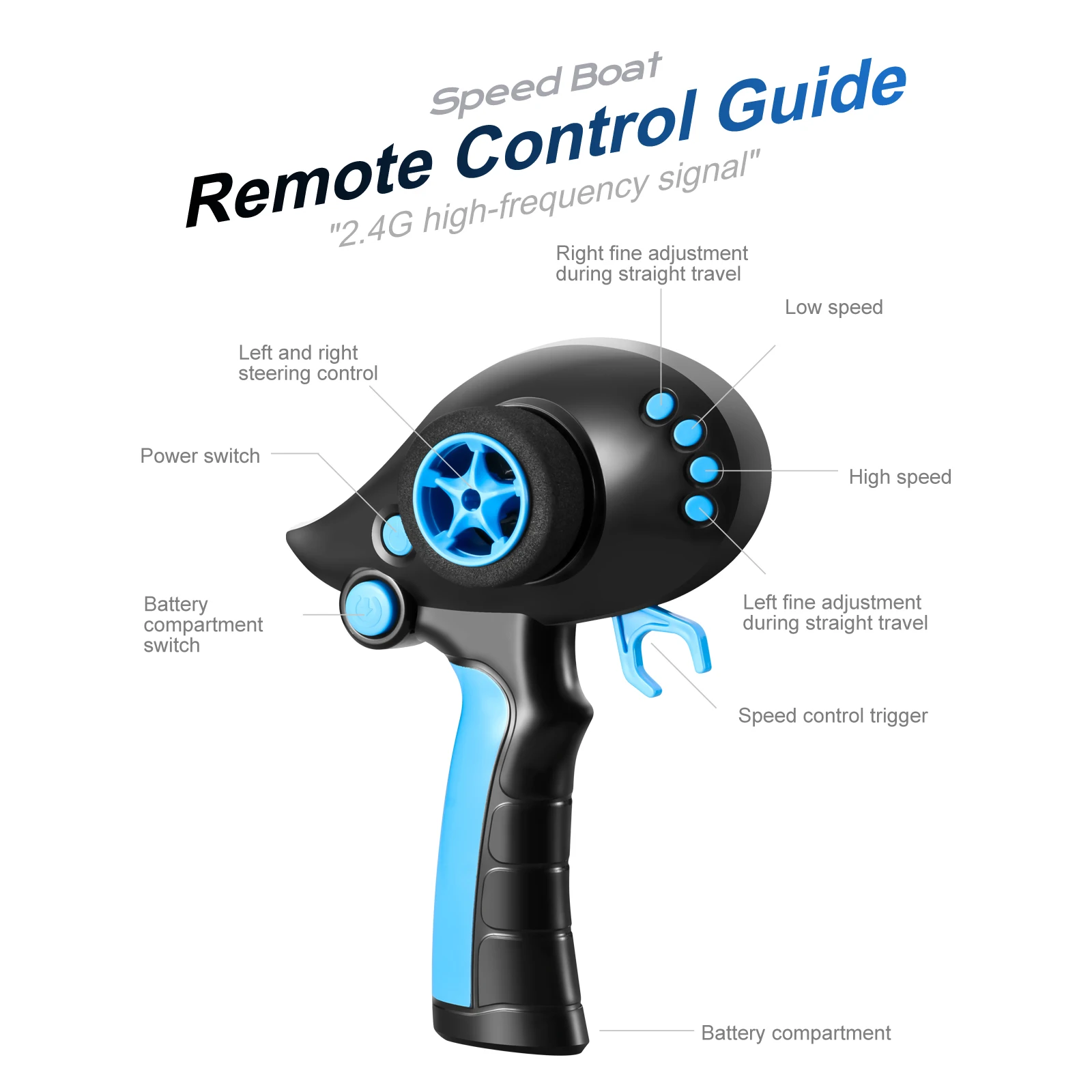 Señal de alta frecuencia 4.2.4G: el barco de radiocontrol tiene una velocidad rápida y buena respuesta.El controlador es fácil de agarrar y enseñar para manos pequeñas.
