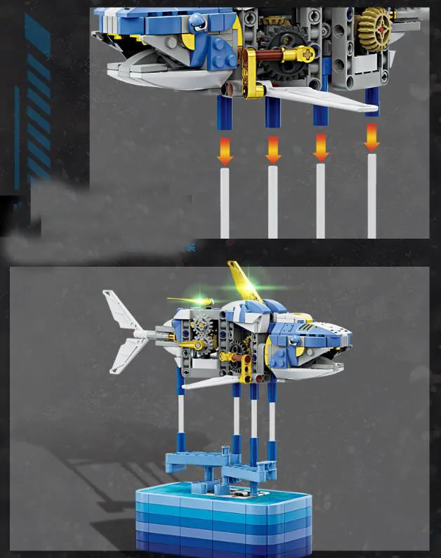Comprar Bloque de tiburón mecánico con engranaje giratorio con Base, Mini Animal marino, juguete de construcción, decoración del hogar