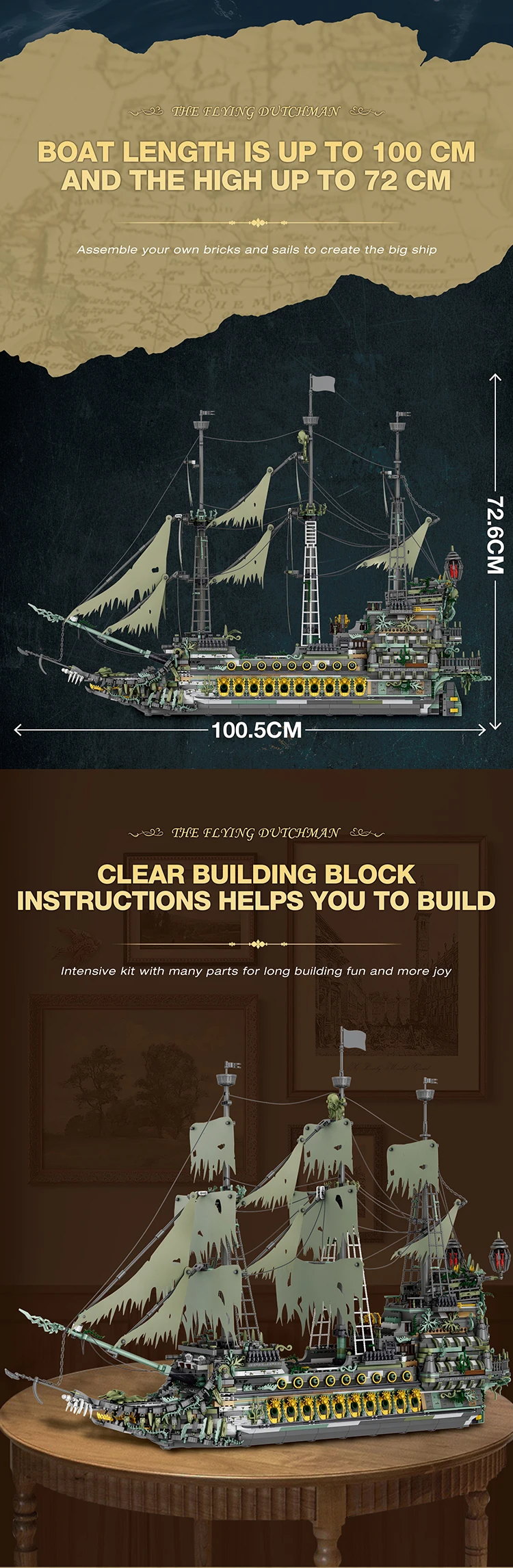 1. Diseño realista de barco Pirata fantasma: con su diseño detallado y sus ladrillos de ensamblaje, este modelo reproduce el infame barco Flying Dutchman de leyendas y películas, brindando una experiencia de construcción cautivadora e inmersiva.