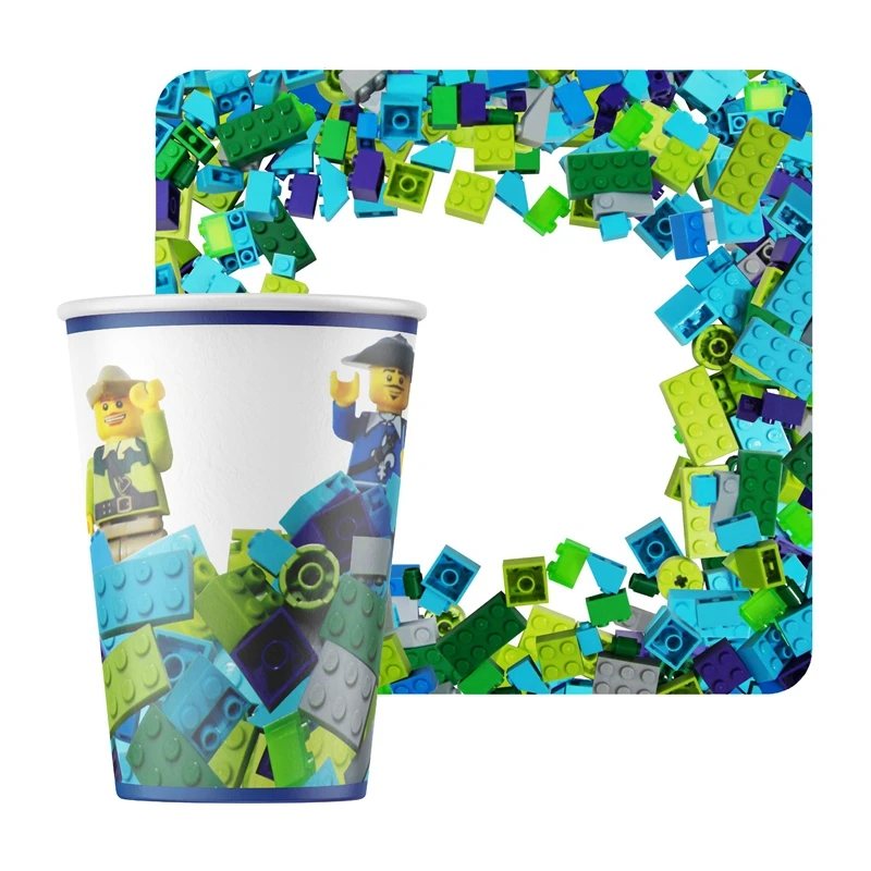 Bloques de construcción juguetes para niños suministros de fiesta temática vajilla desechable taza plato globo telón de fondo para decoración de fiesta de cumpleaños