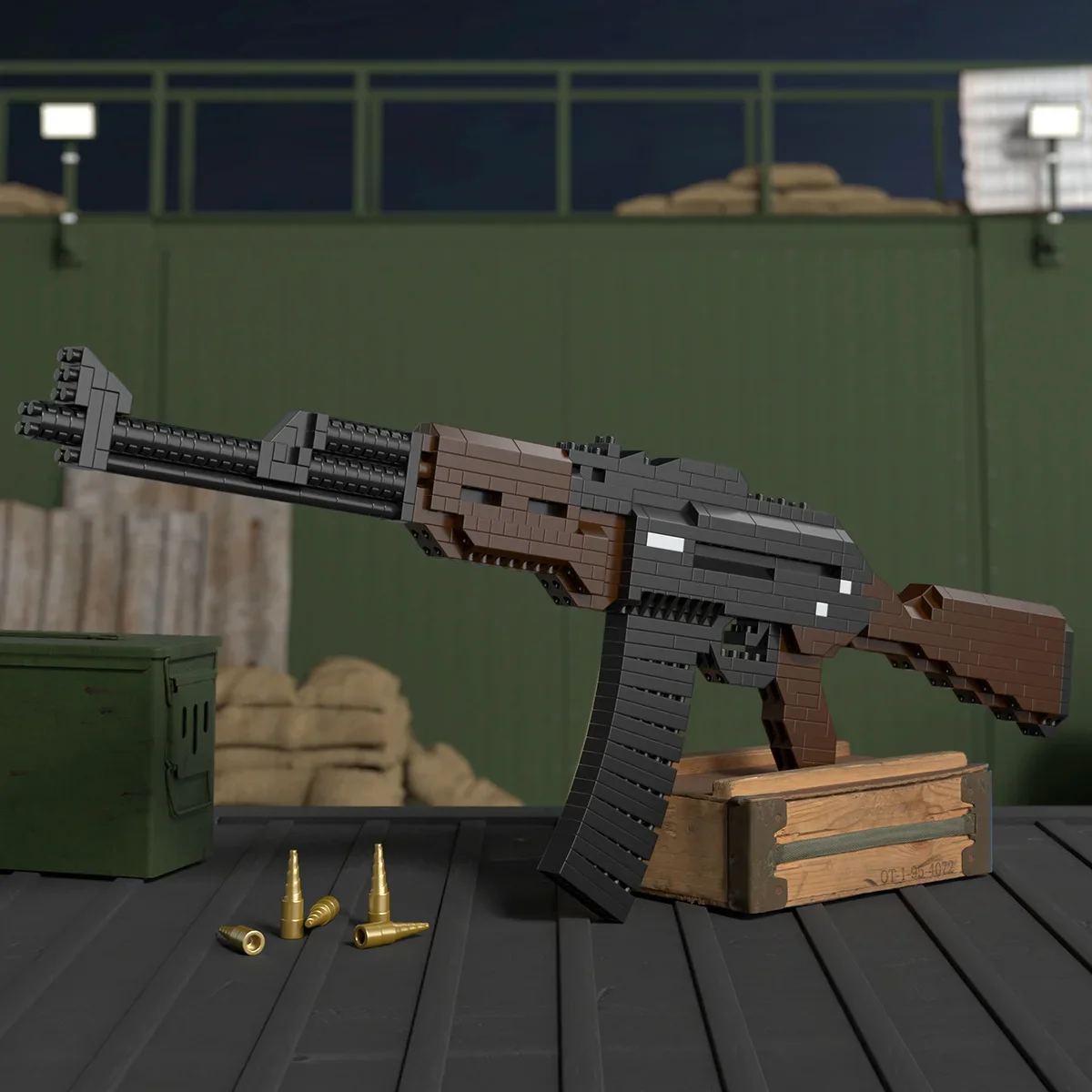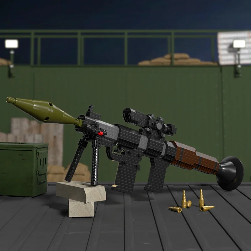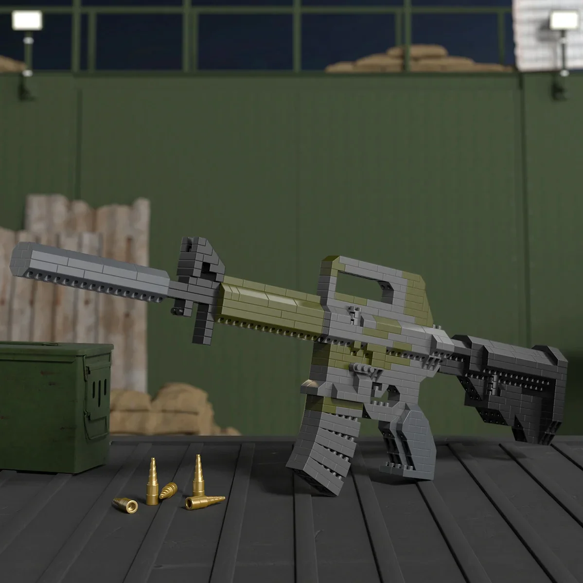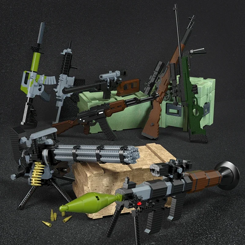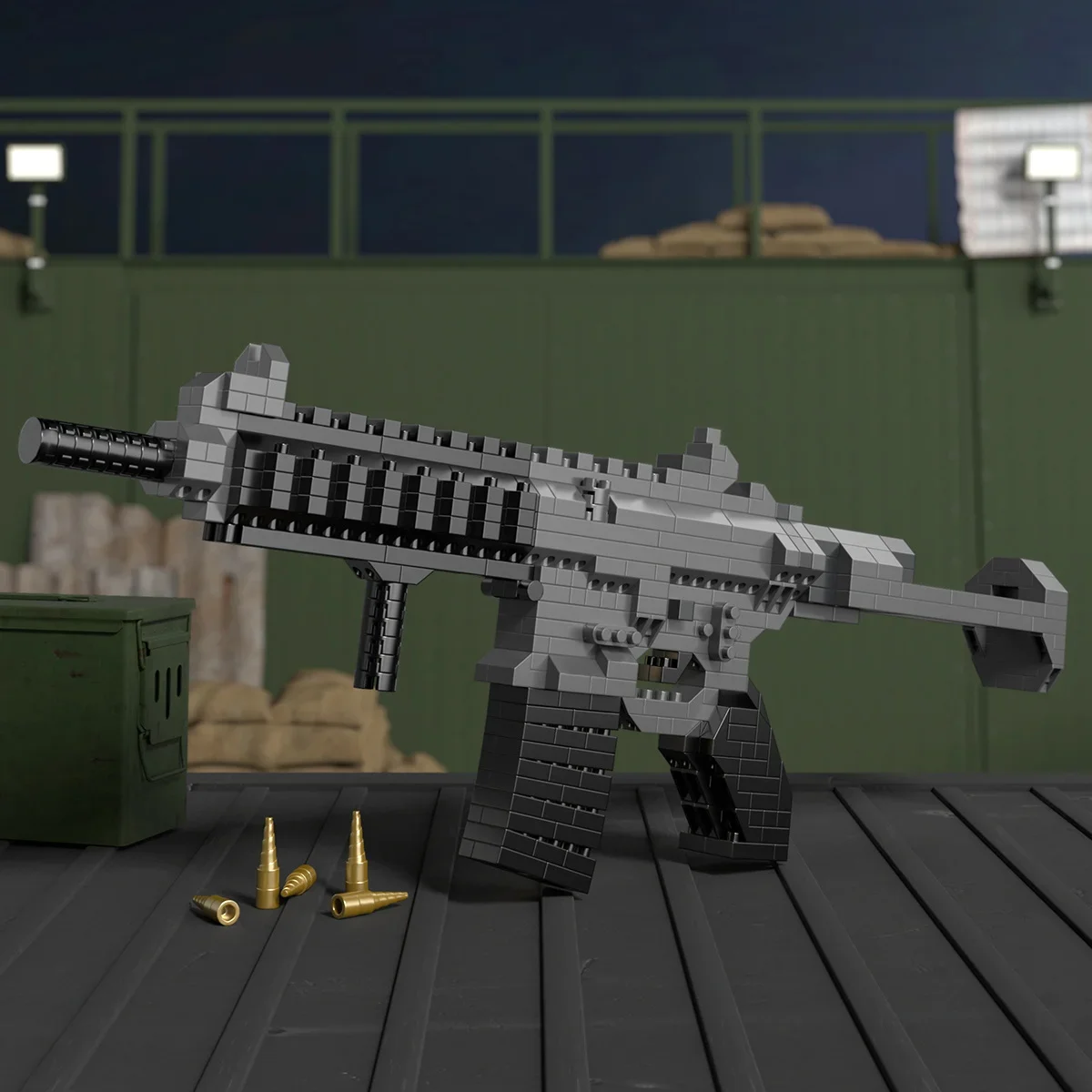 1. Bloques de construcción de submáquina de armas del ejército:Este juego de pistolas de juguete incluye un modelo de metralleta hecho de bloques de construcción, lo que brinda a los niños una forma única y creativa de ensamblar y jugar con su propia pistola de juguete.