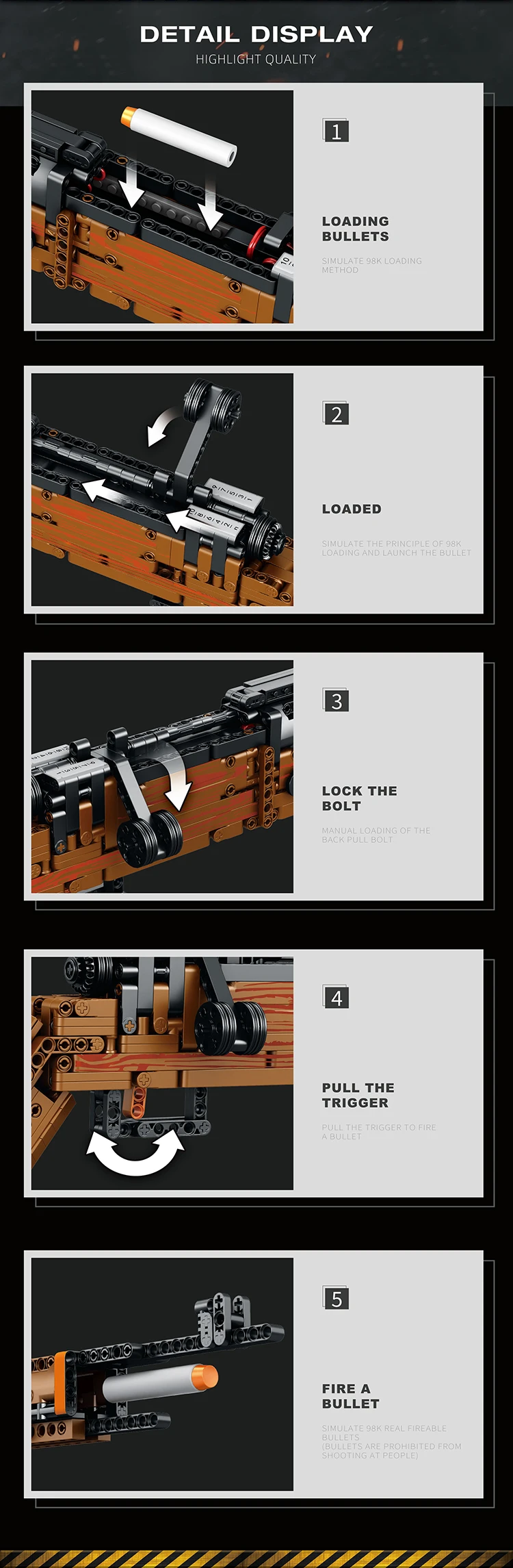4. Regalo de Navidad perfecto: Con la temporada navideña que se acerca, nuestros bloques de construcción modelo de rifle de asalto son un regalo de Navidad perfecto para niños interesados en juguetes con temática militar.Este regalo único y emocionante traerá alegría y emoción a su mañana navideña, permitiéndoles crear e imaginar sus propias aventuras militares.