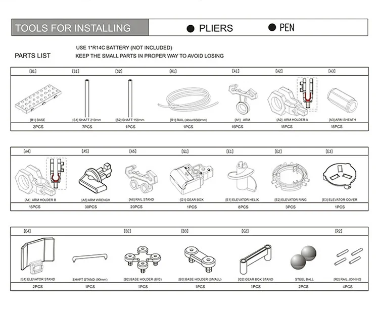 2.Asegúrese de observar atentamente cada pieza antes de comenzar a ensamblar y recuerde el nombre y la función principal correspondientes al manual.