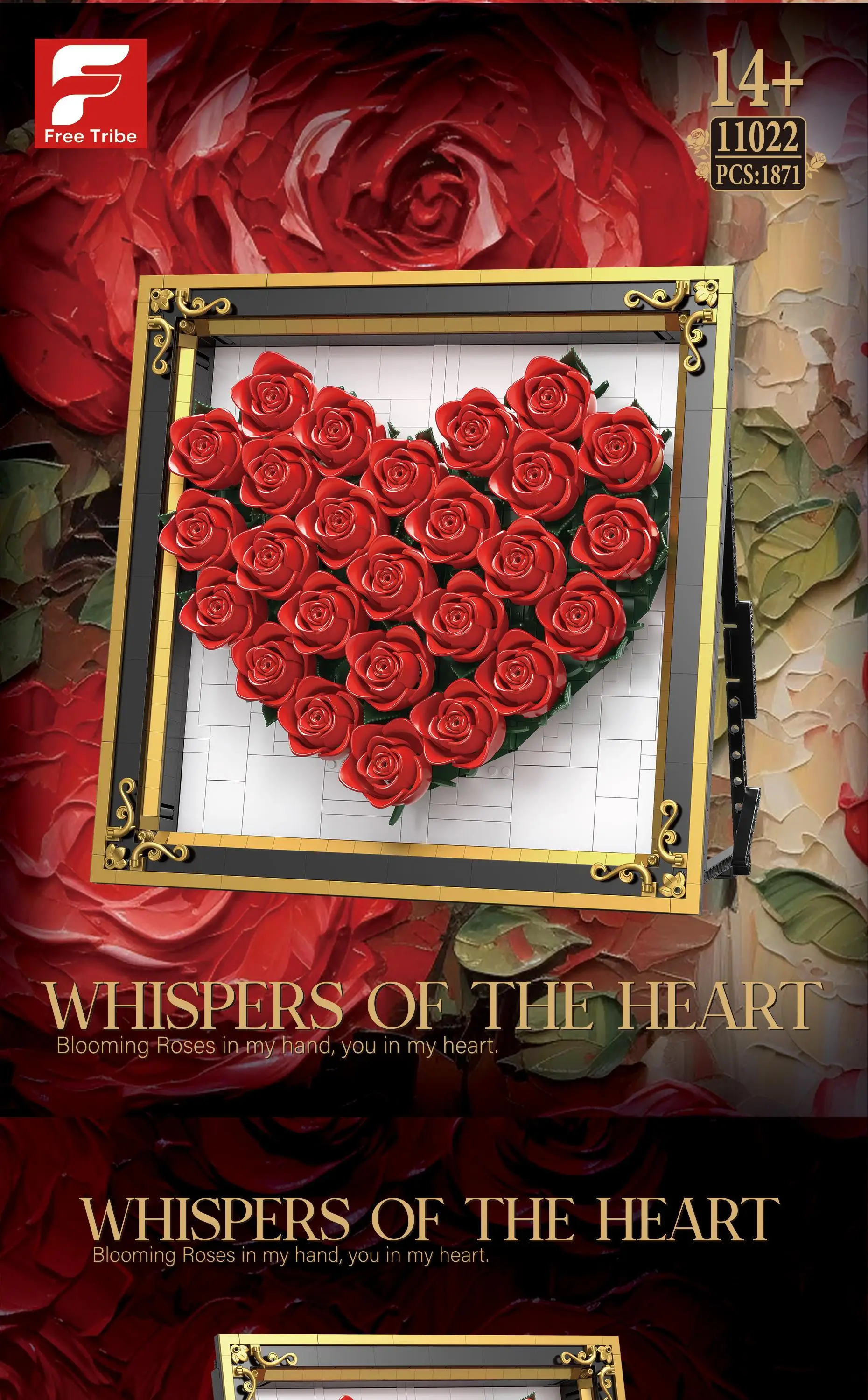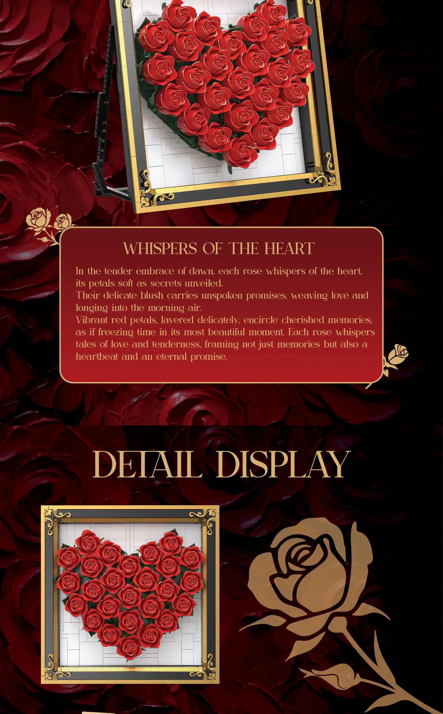 ✨Diseño de doble uso: rosa en forma de corazón y marco de fotos Con 1871 ladrillos de precisión, el juego ensambla un romántico arreglo de rosas en forma de corazón integrado con un marco de fotos.Restaura los delicados pétalos en capas de rosas y el contorno clásico de un corazón, mientras que el marco de fotos incorporado puede contener pequeñas fotografías o notas, mezclando belleza floral con almacenamiento sentimental.