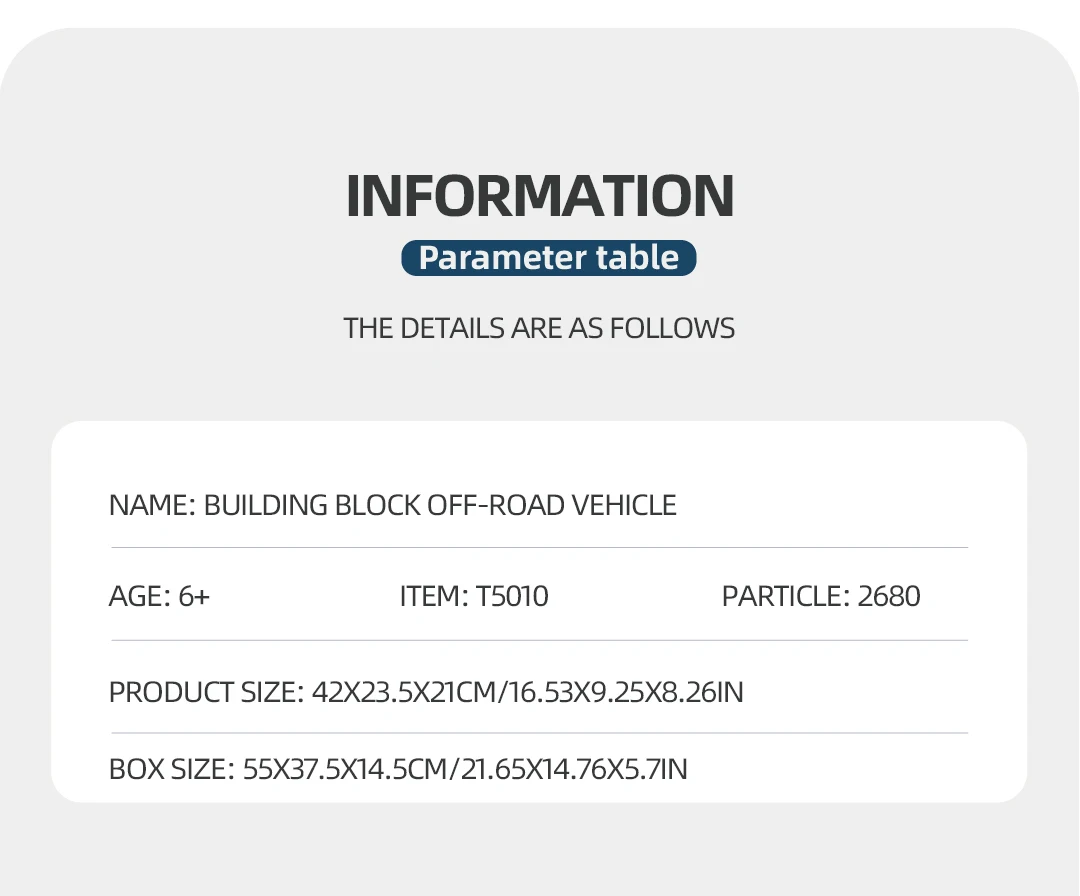✨Regalo ideal para diversas ocasiones: ya sea un regalo de cumpleaños, vacaciones o Navidad, este juego de bloques de construcción para vehículos todoterreno es una elección perfecta.Su combinación única de valor educativo, diversión y atractivo estético lo convierte en un regalo versátil que hará las delicias de niños y adultos de todas las edades.Tenga en cuenta que el conjunto de control remoto se vende por separado para mayor funcionalidad.