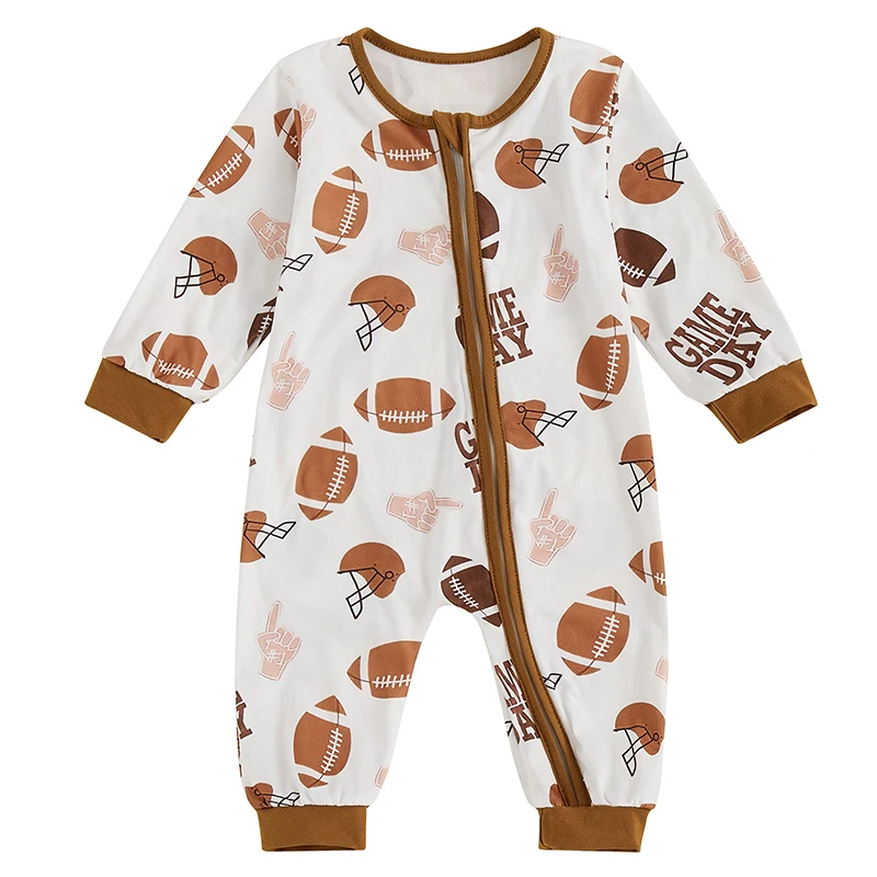 Bebé niño con cremallera monos fútbol estampado de letras acanaladas manga larga cuello redondo otoño mameluco