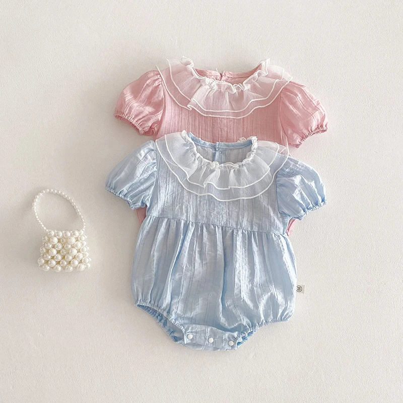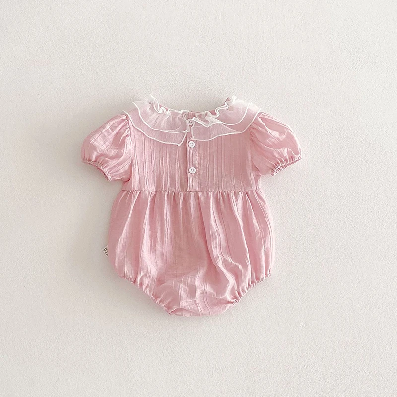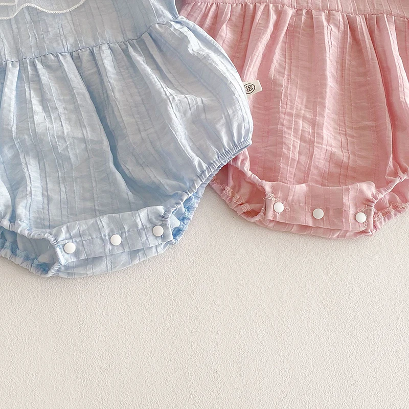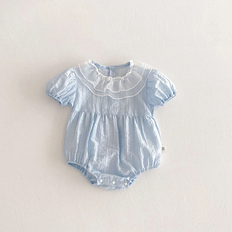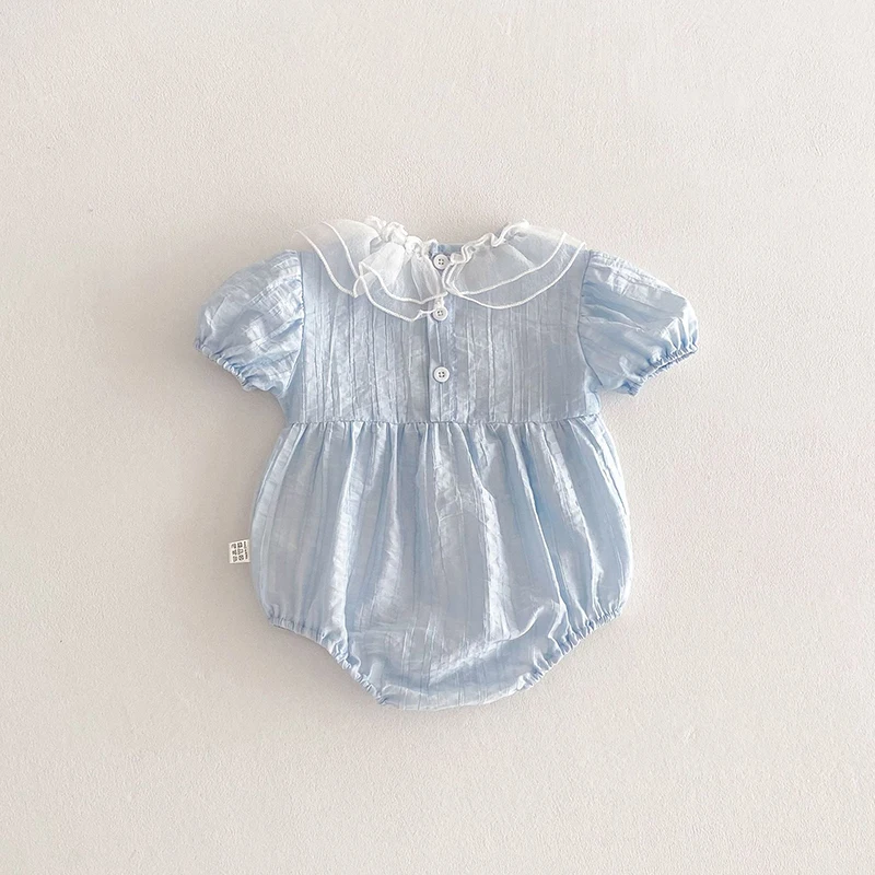 The bodysuit features a charming lace lotus leaf collar, adding a touch of elegance to your baby's summer wardrobe.