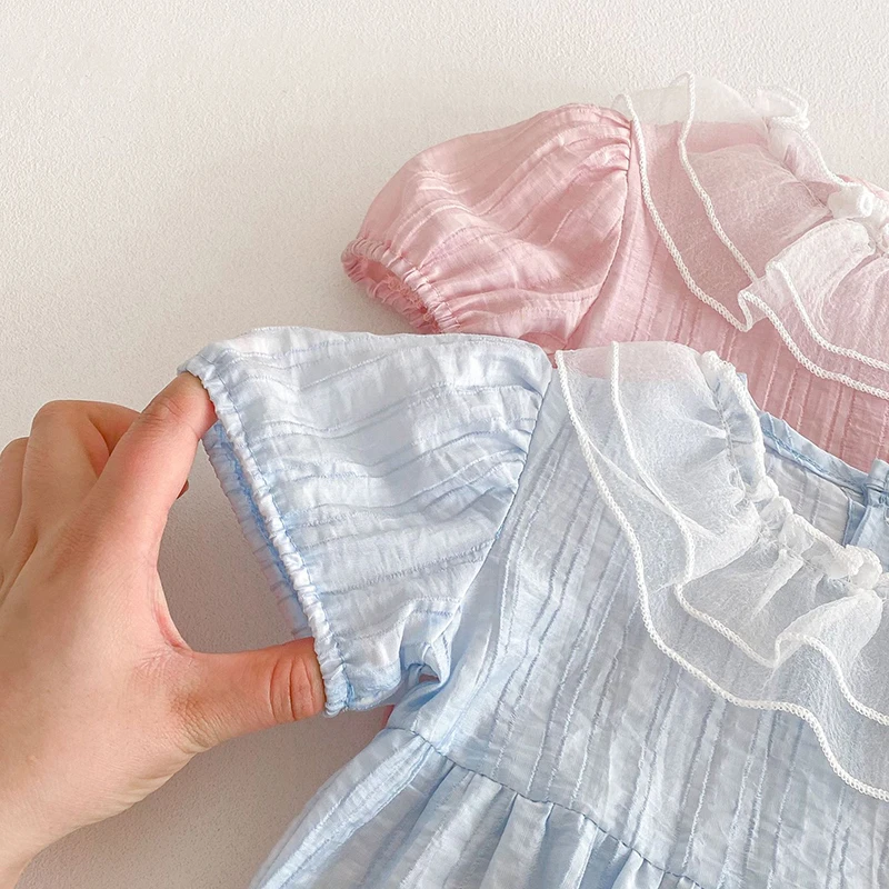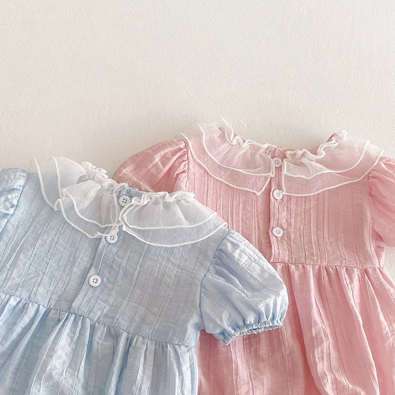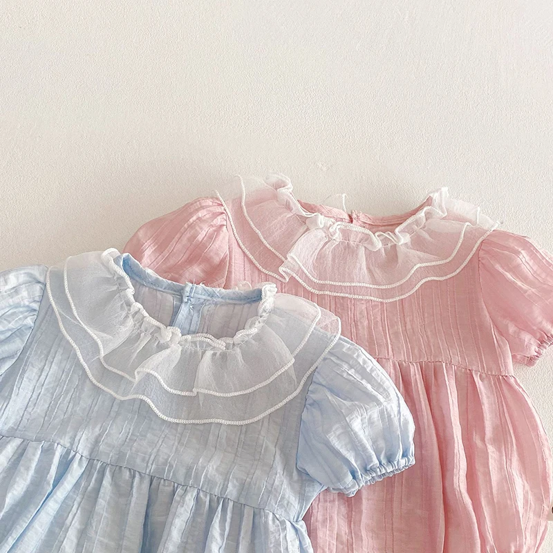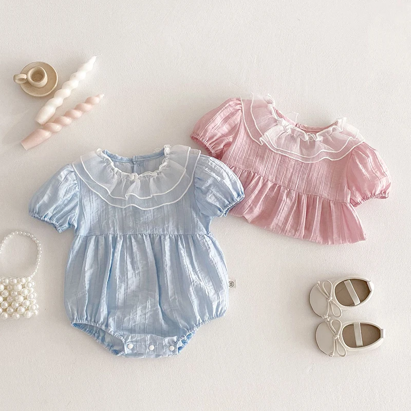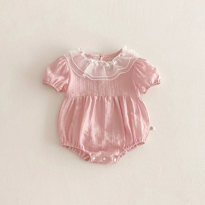 The bodysuit features a charming lace lotus leaf collar, adding a touch of elegance to your baby's summer wardrobe.