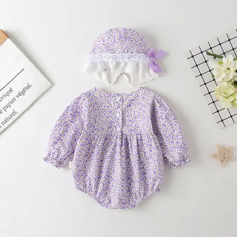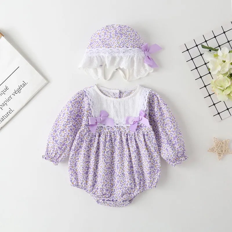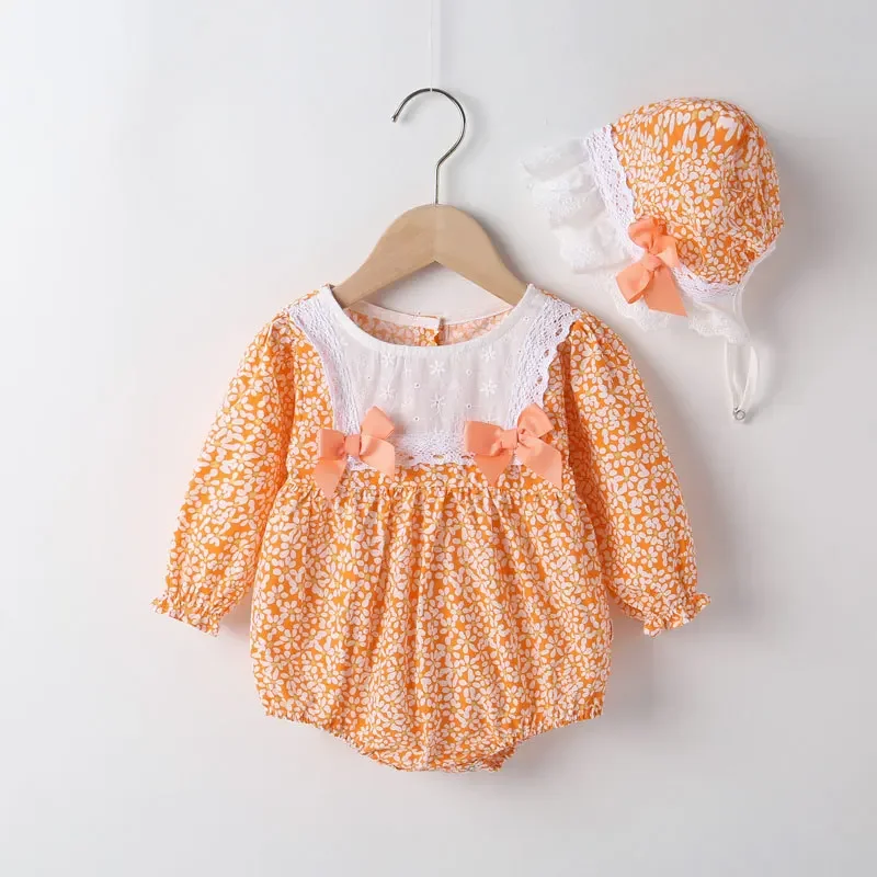 Body de verano para niñas recién nacidas, moda coreana, bonito lazo, flores, encaje, monos de manga larga de algodón + sombrero, ropa para bebés BC1836