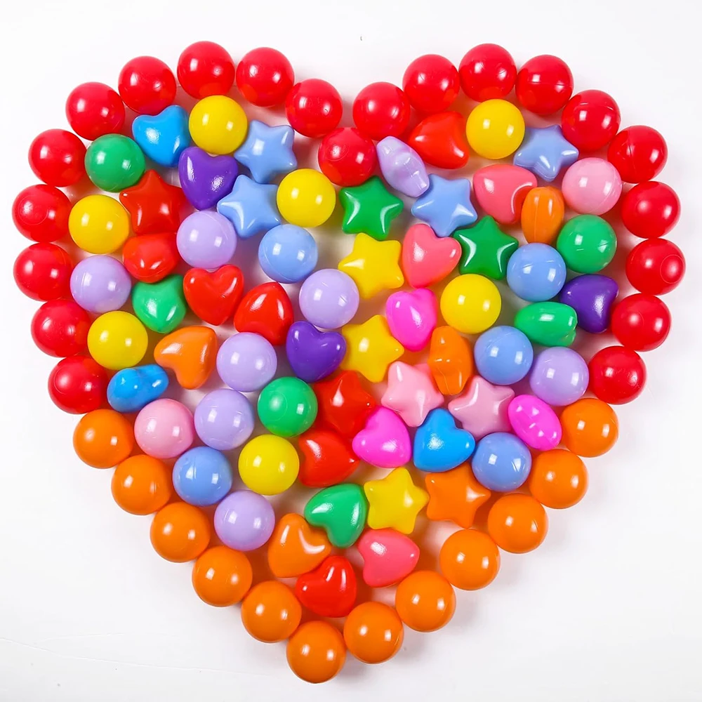 DIFERENTES BOLAS EN FORMA: Tiene bolas redondas, estrellas, bolas de corazón, cabeza de oso, arcoíris y colores de macarrón, bueno para el reconocimiento de colores y formas de los niños, capacidad de conteo, capacidad de almacenamiento, imaginación, coordinación física, pensamiento lógico.