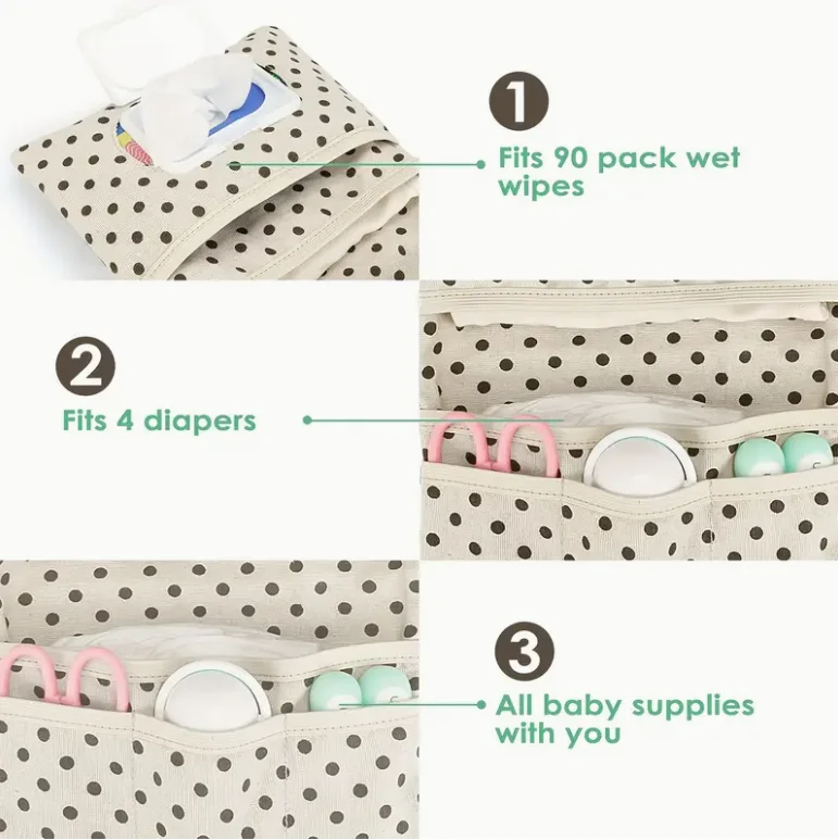 Bolsa de almacenamiento de pañales portátil y organizador de toallitas húmedas con múltiples compartimentos, bolsillo con cremallera y etiqueta colgante, bolsa de aseo para mamá