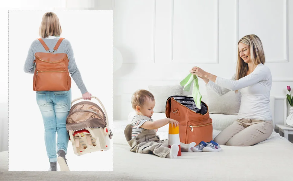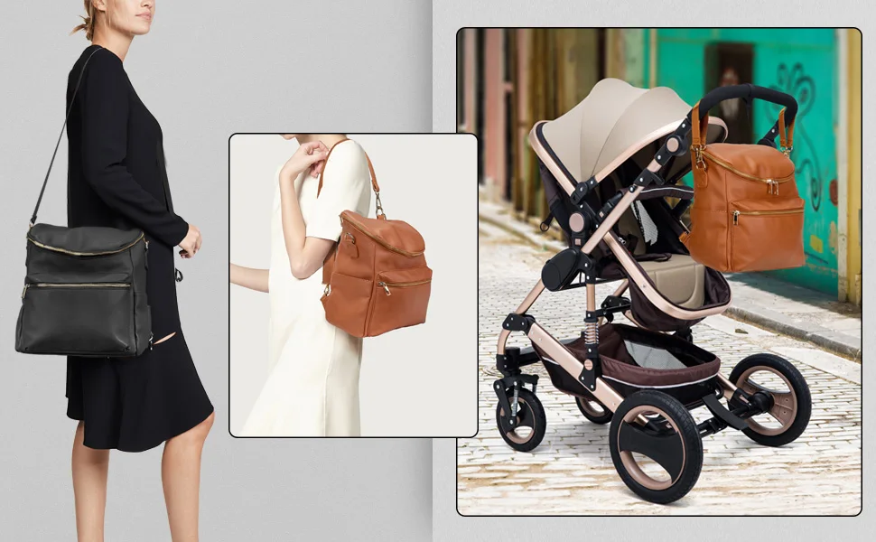Bolsa de pañales Mochila Mochila de cuero para mujer Mochila de viaje Bolsa de bebé grande con correas Troller Capacidad para ropa mojada