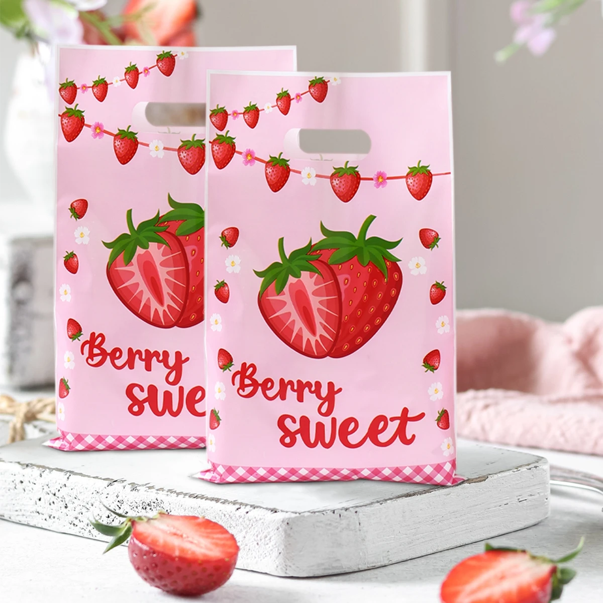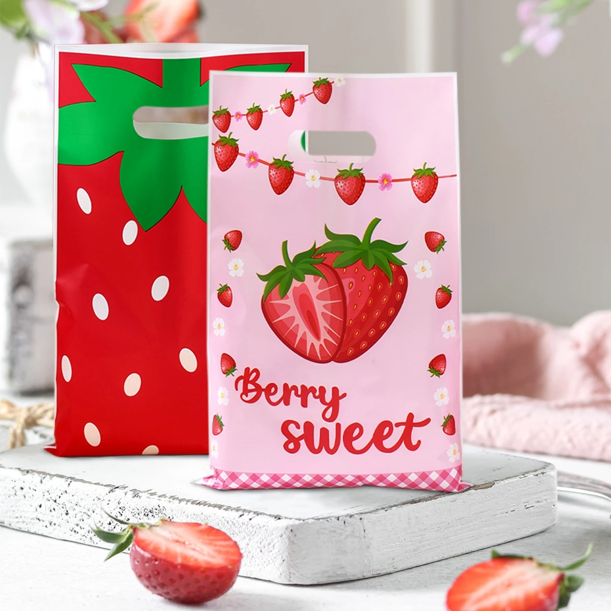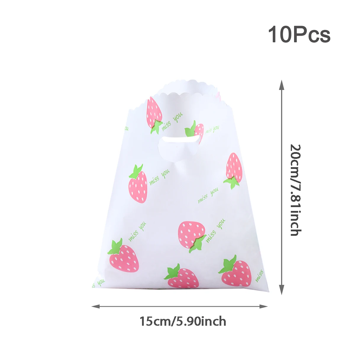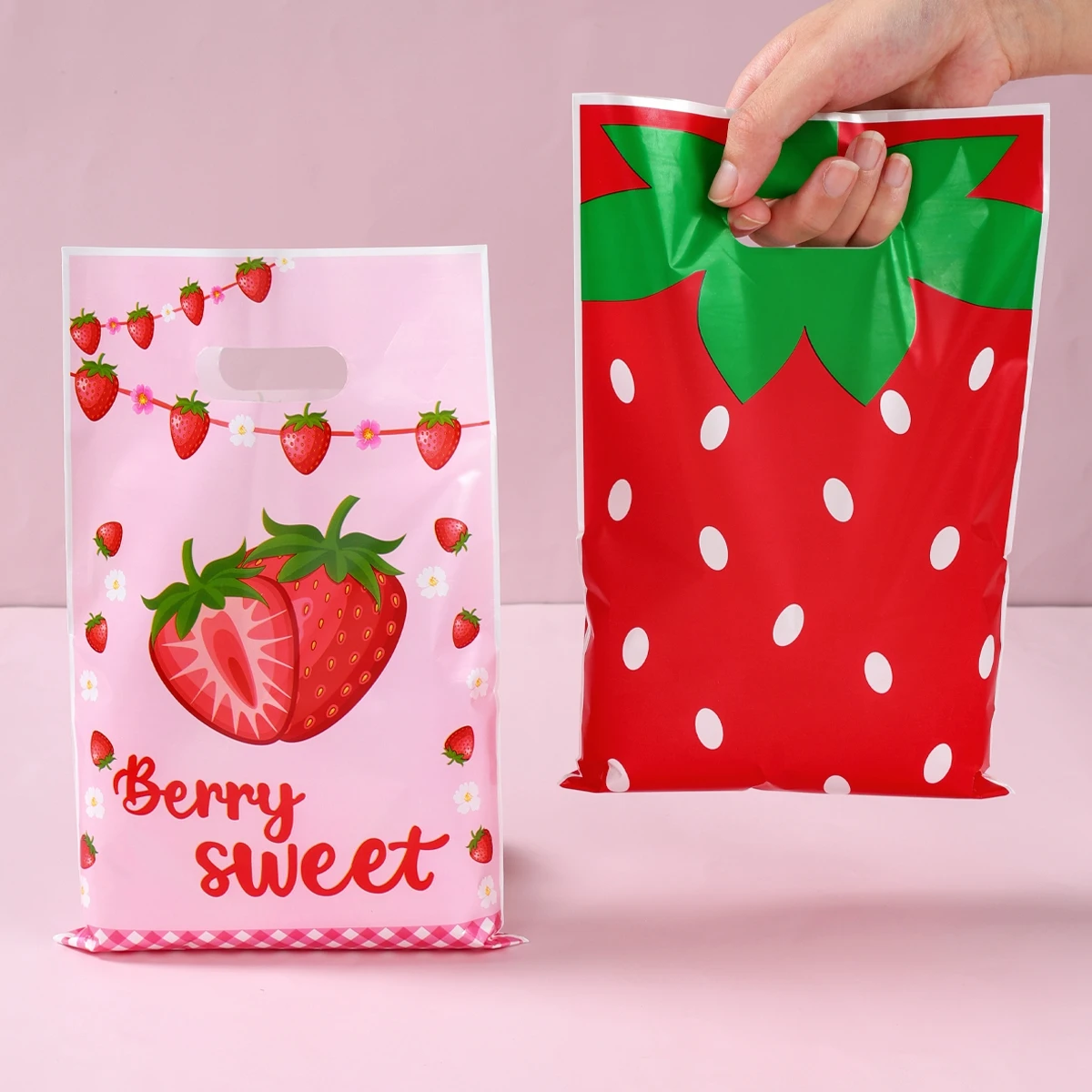 Bolsa de plástico de fresa con bonito diseño de fruta, bolsa de regalo de mano, ropa, cocina, compras, fiesta, embalaje de regalo, bolsas reutilizables, 10 Uds.