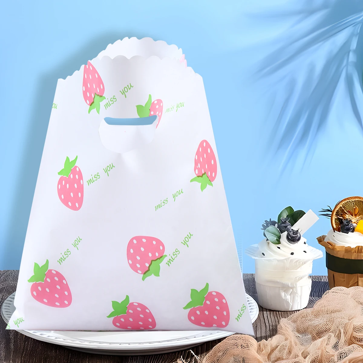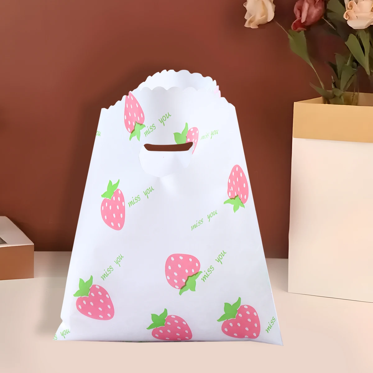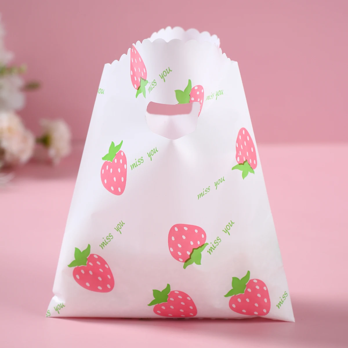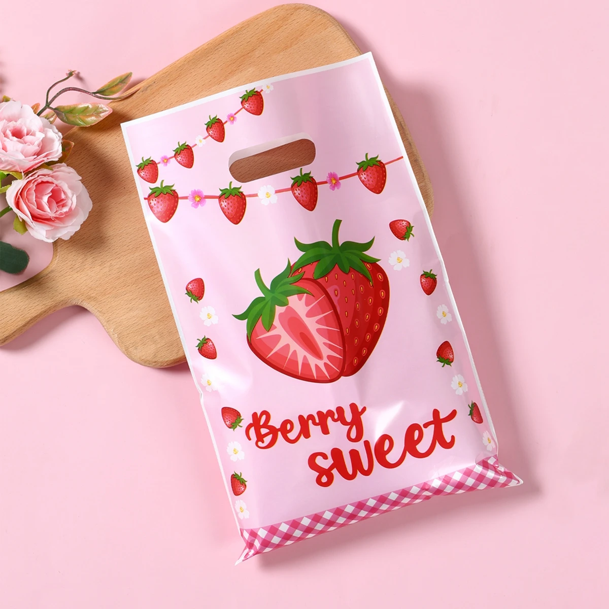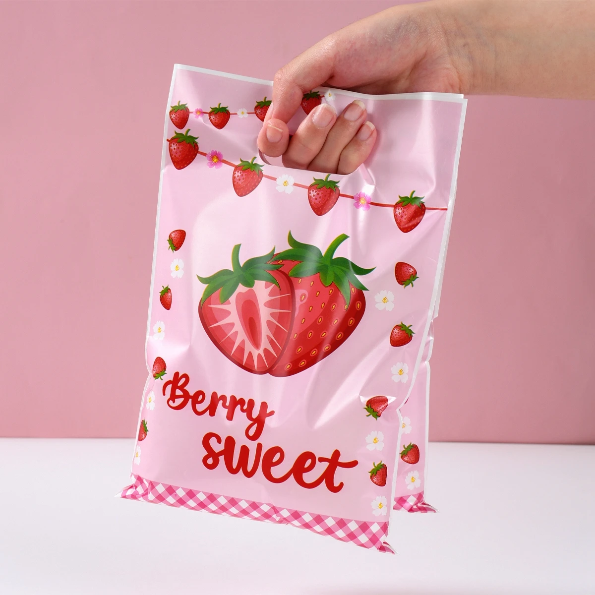 Bolsa de plástico de fresa con bonito diseño de fruta, bolsa de regalo de mano, ropa, cocina, compras, fiesta, embalaje de regalo, bolsas reutilizables, 10 Uds.