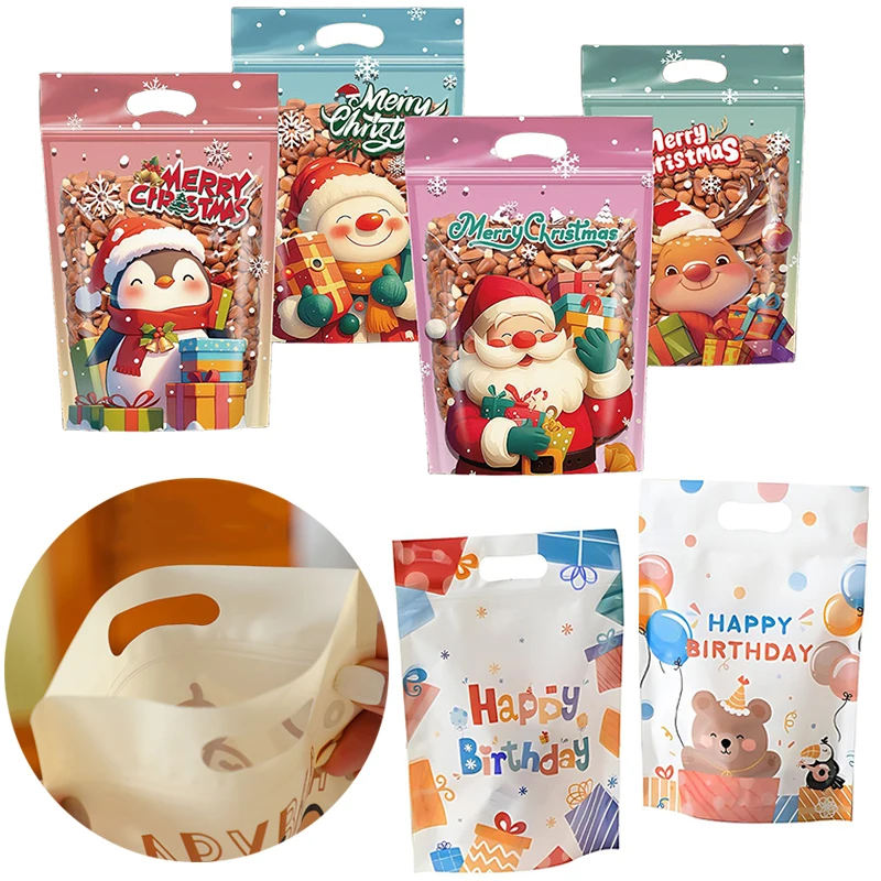 Comprar Bolsa de regalo de sellado de plástico con patrones de dibujos animados, paquete de 10/20/30/50 Uds., joyería de cumpleaños, estilo de Feliz Navidad, bolsas de mezcla aleatoria disponibles ZYF