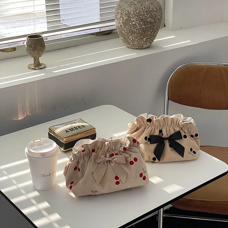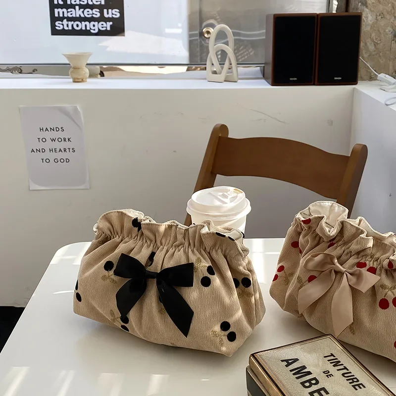 Bolsas de maquillaje de cereza de pana suave para mamá, bolsa de mamá, organizador de pañales para bebés, bolso de noche con lazo para mujer, bolso de maternidad
