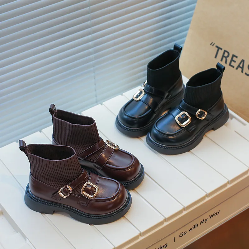 Botas cortas de estilo británico para niños, zapatos con hebilla de cinturón para niña, zapatos de cuero informales sin cordones, botines de punto de princesa, color negro y marrón