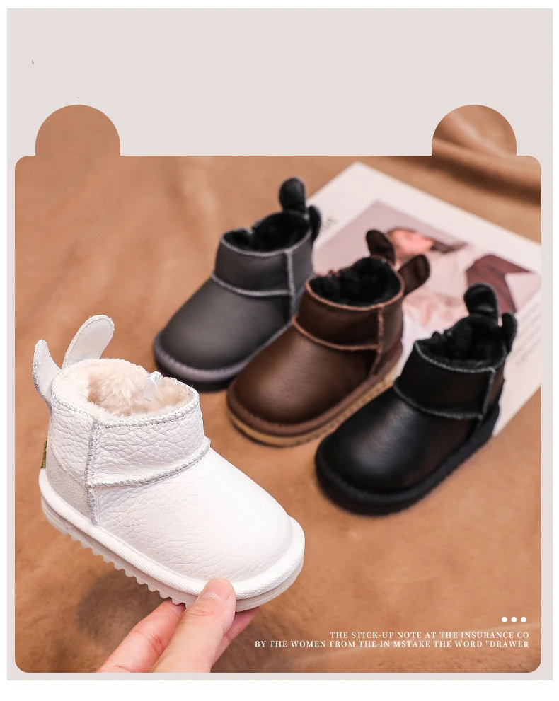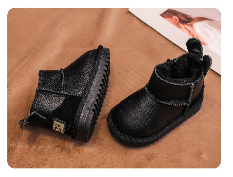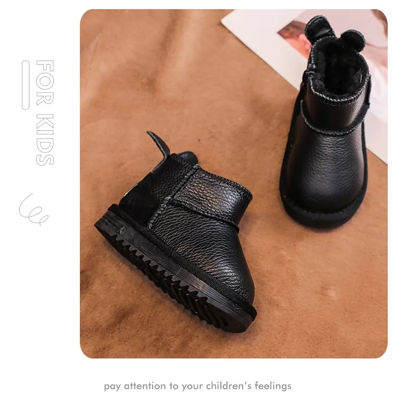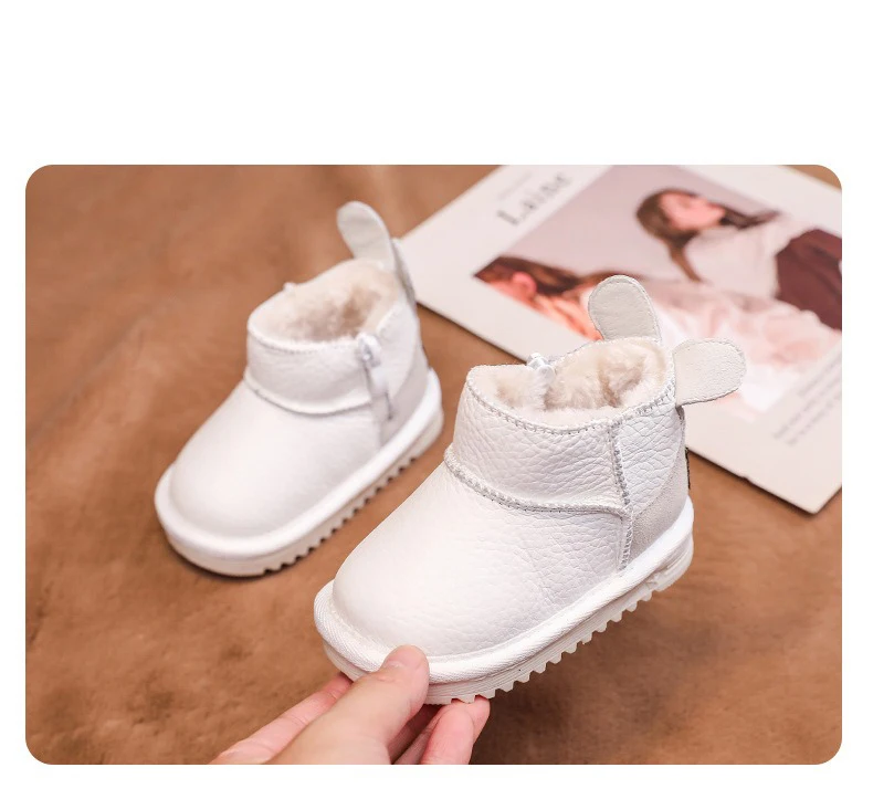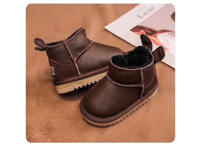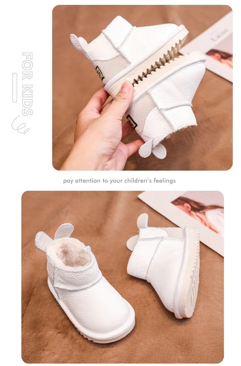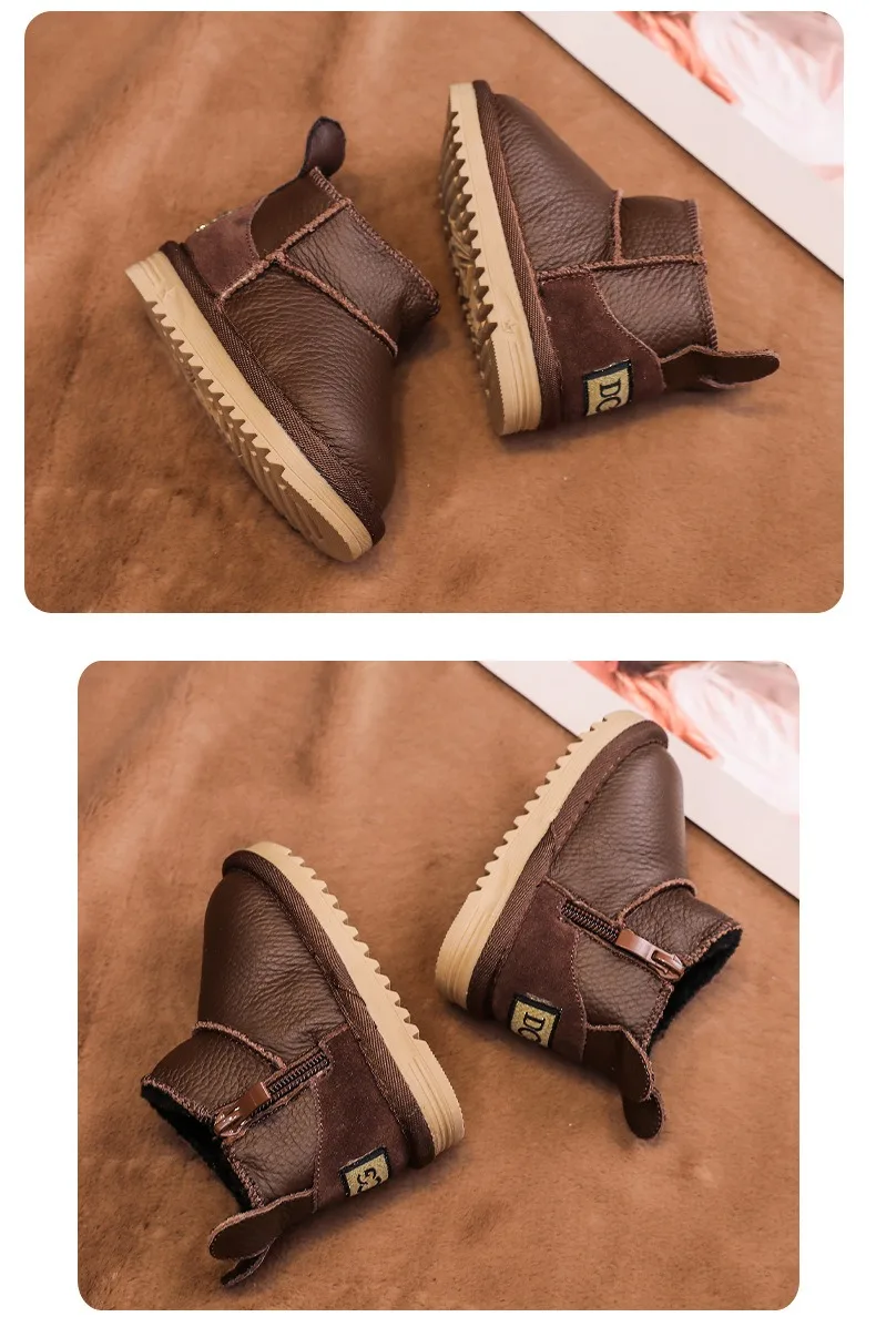 Botas de invierno de cuero genuino para niños, zapatos para bebés y niños, botas de nieve infantiles de felpa, zapatos antideslizantes de suela blanda para niños pequeños