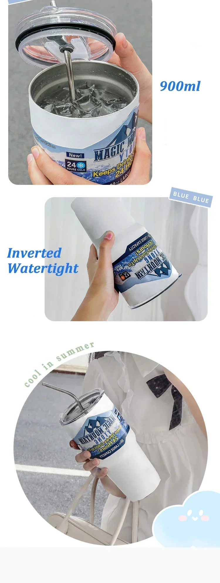 Termo de congelación de acero inoxidable de 900ml con pajita, bebida de café helado, botella aislada al vacío, taza termostática para viajes en coche al aire libre