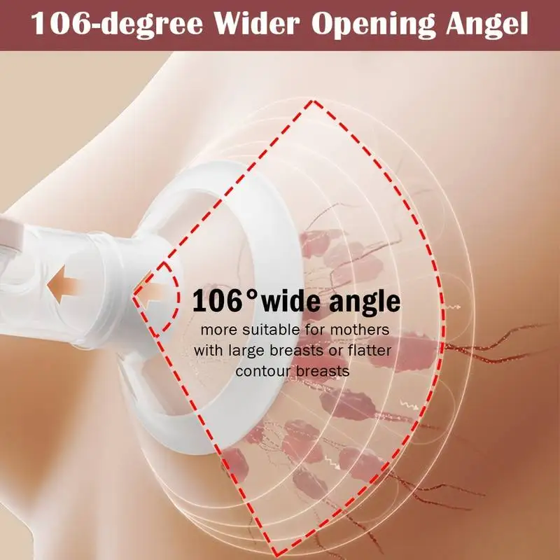 【Ángel de apertura más amplia de 106 grados】: Diseño de forma ovalada con apertura gran angular de 106 grados, más adecuado para madres con senos grandes o senos contornos más planos.Tamaño de copa más grande para un área más cubierta de los senos durante el extracción; Diseño de forma ovalada para girar y adaptarse para un bombeo cómodo