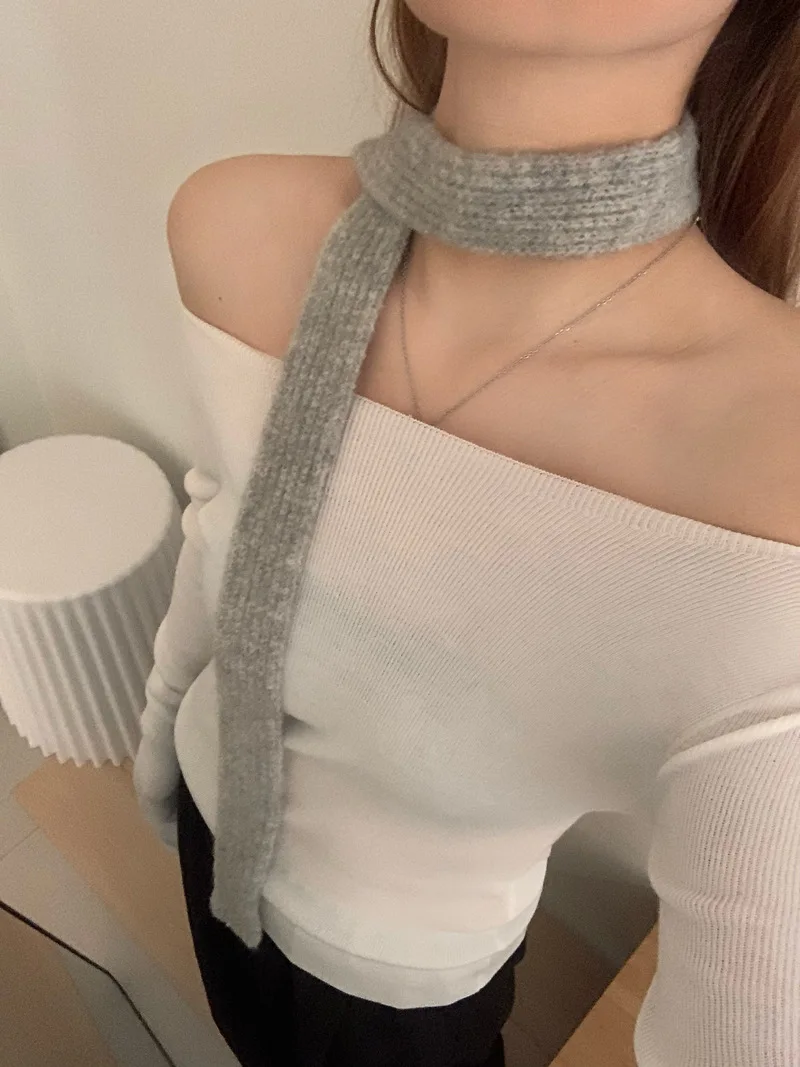 Comprar Bufanda fina de lana suave y ondulada, bufanda larga de punto de Color sólido, delgada y estrecha, Otoño e Invierno