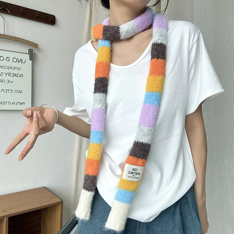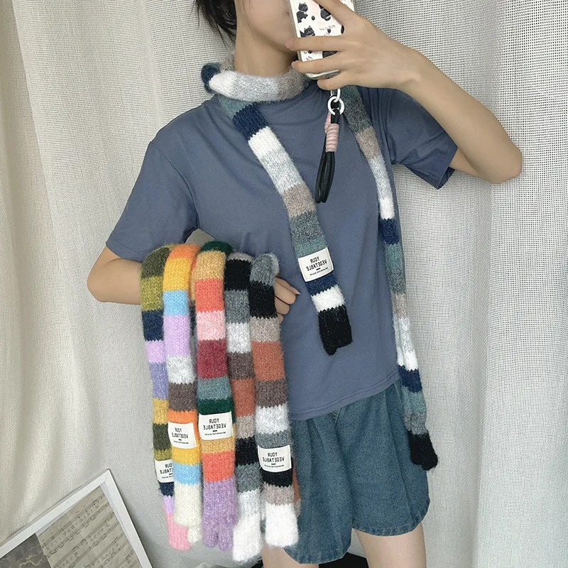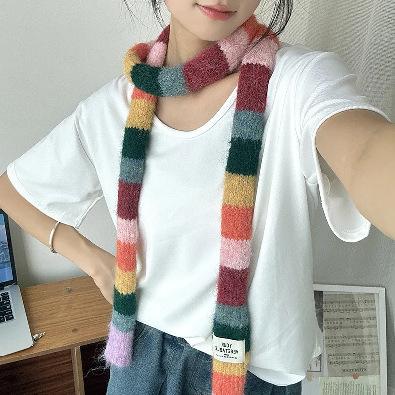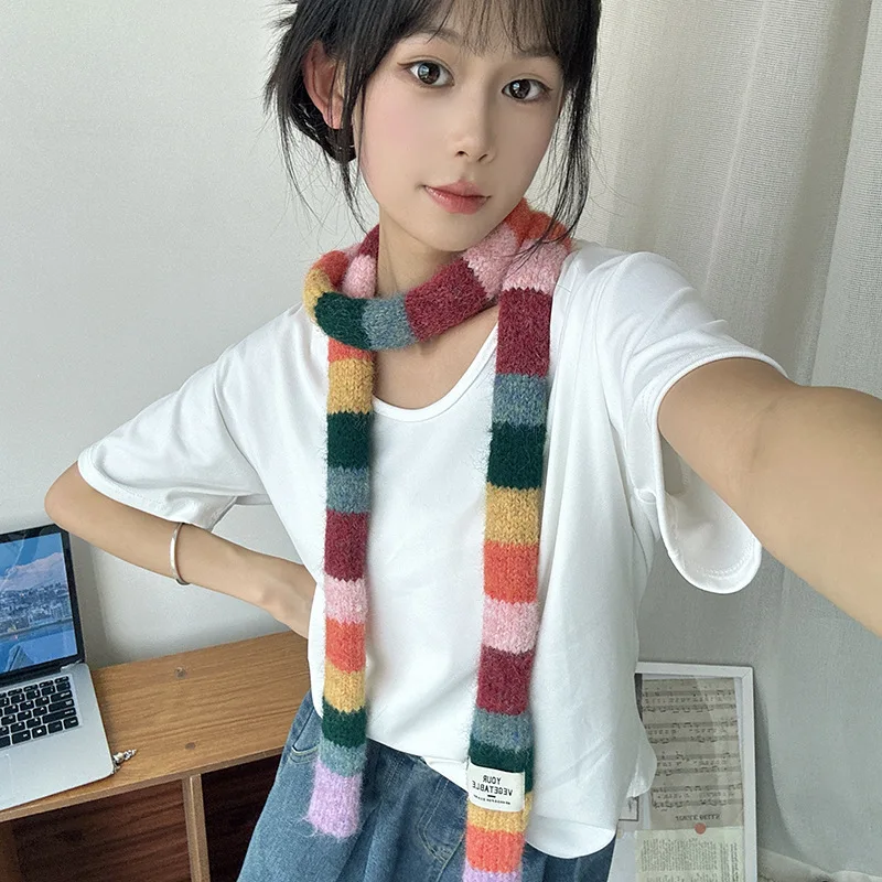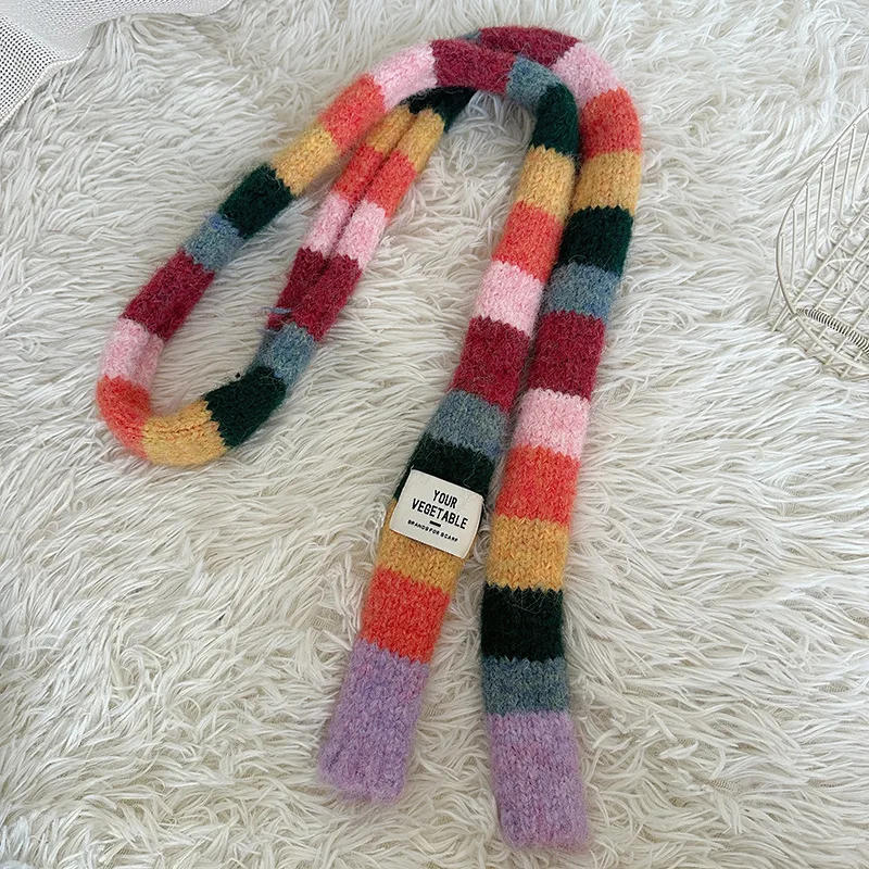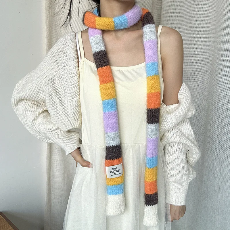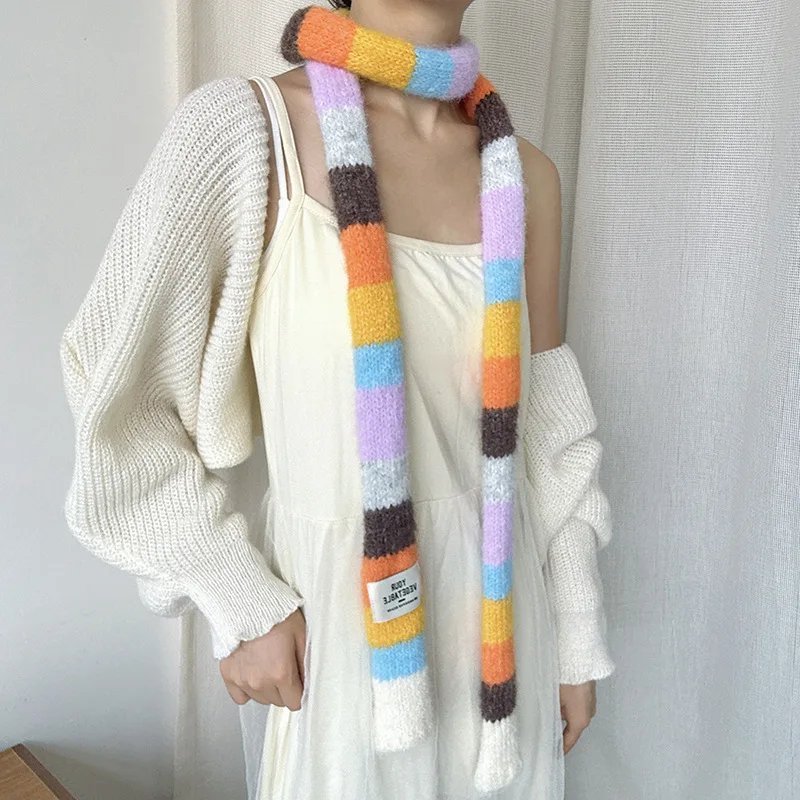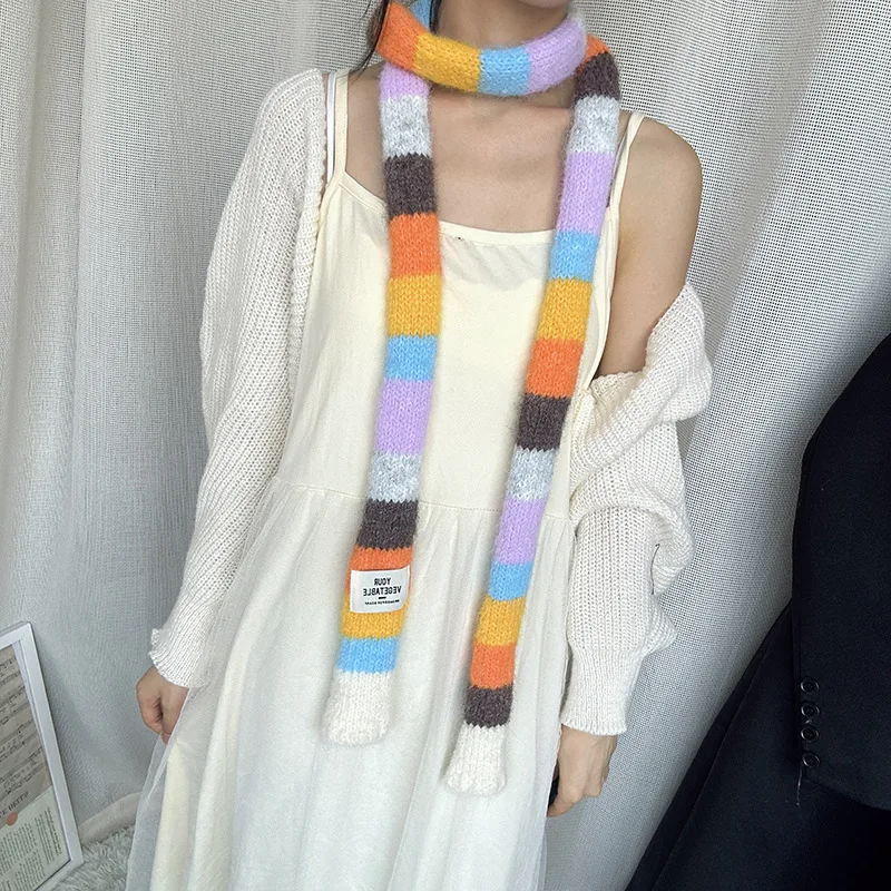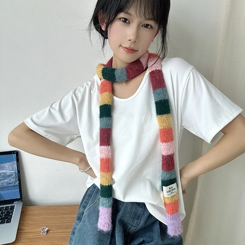 Comprar Bufanda pequeña de punto a rayas de arcoíris, diseño de nicho, bufanda larga y estrecha, nueva moda versátil para mujer
