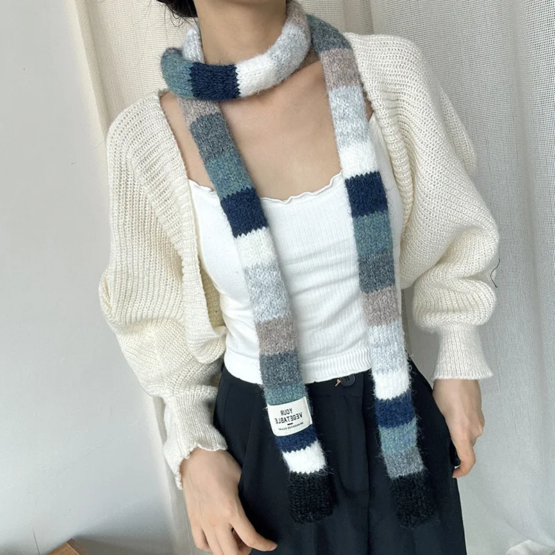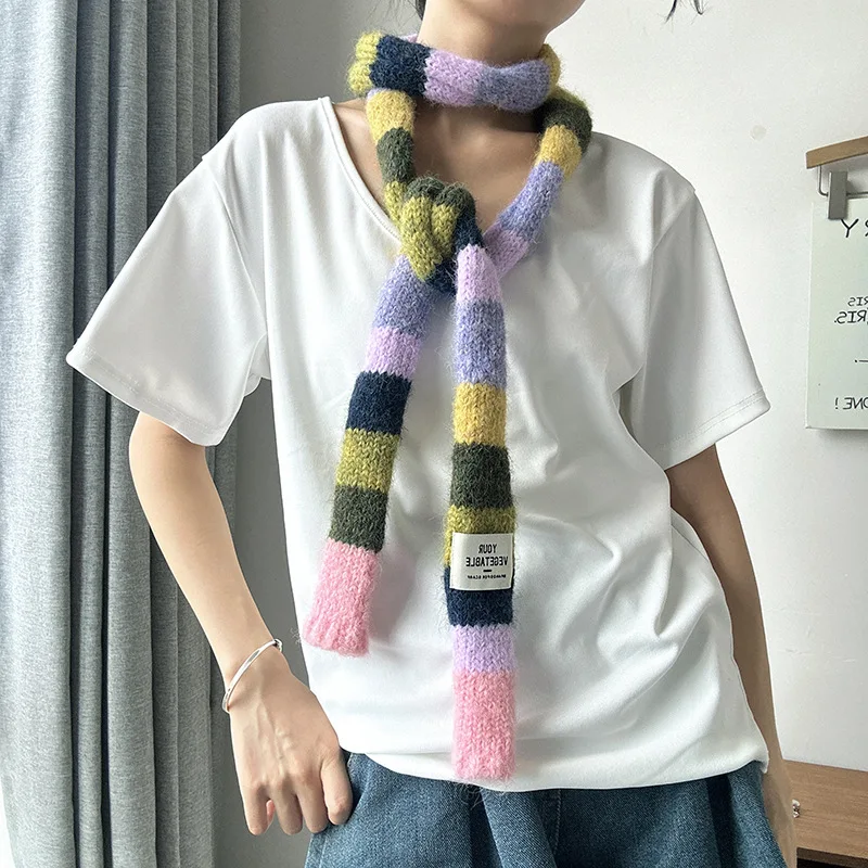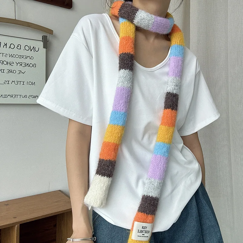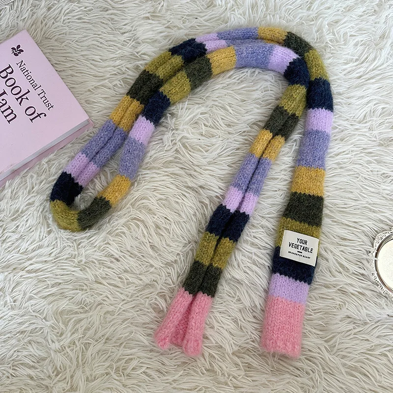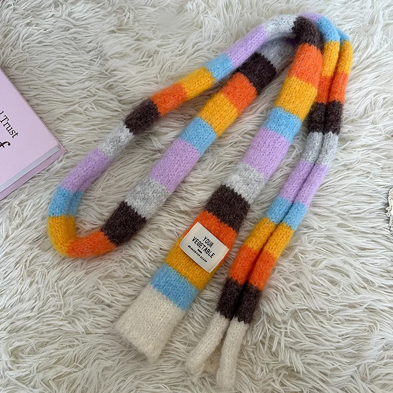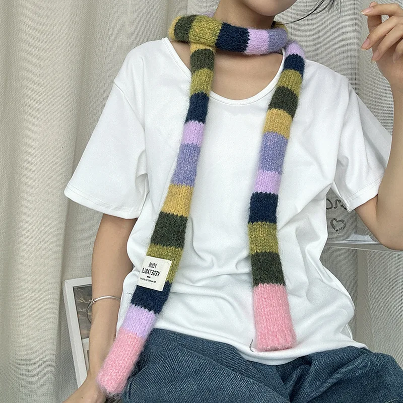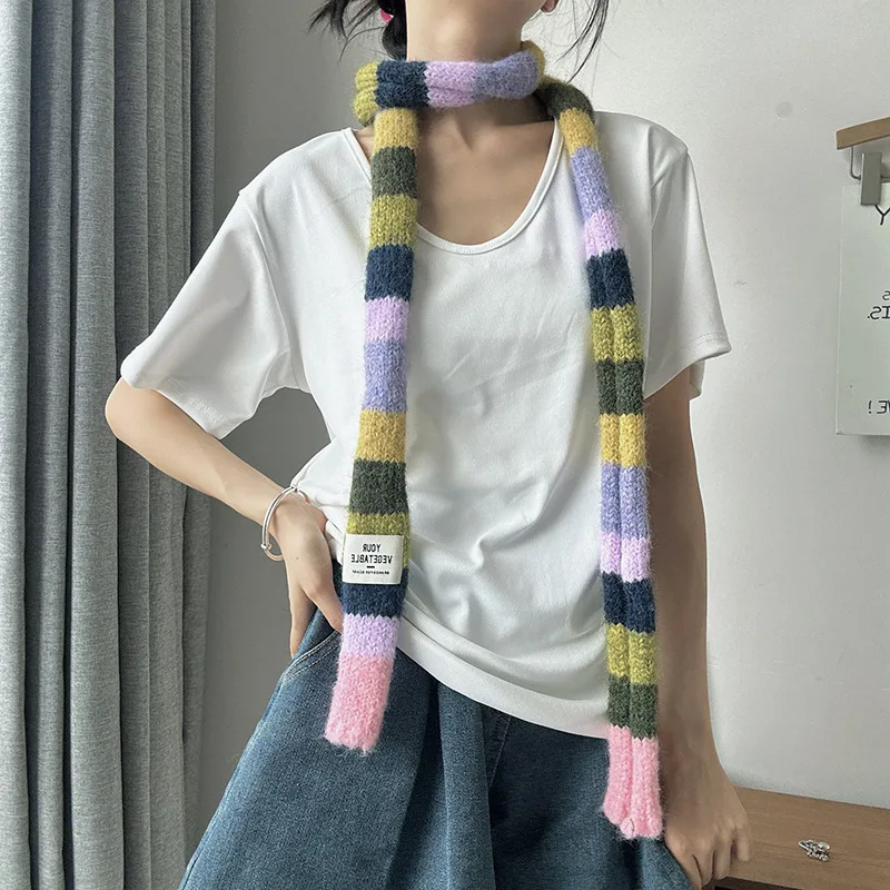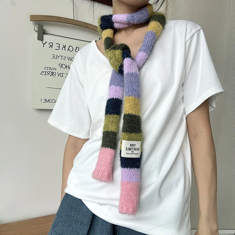 Comprar Bufanda pequeña de punto a rayas de arcoíris, diseño de nicho, bufanda larga y estrecha, nueva moda versátil para mujer