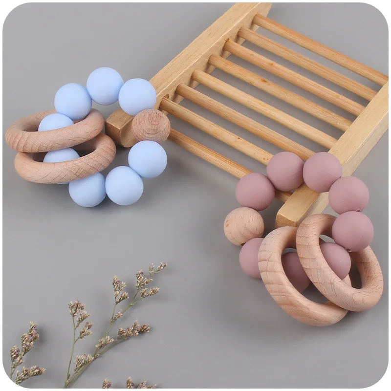 Cadena de chupete hecha a mano de cuentas de silicona de grado alimenticio, joyería de anillo de madera de haya Natural, pulsera ecológica, juguetes seguros