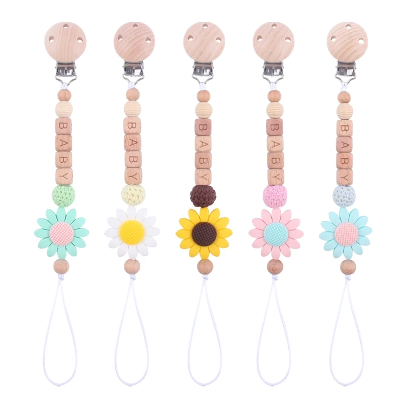 Comprar Cadena de madera para chupete de bebé, sin BPA, cuentas de silicona, arcoíris, Margarita
