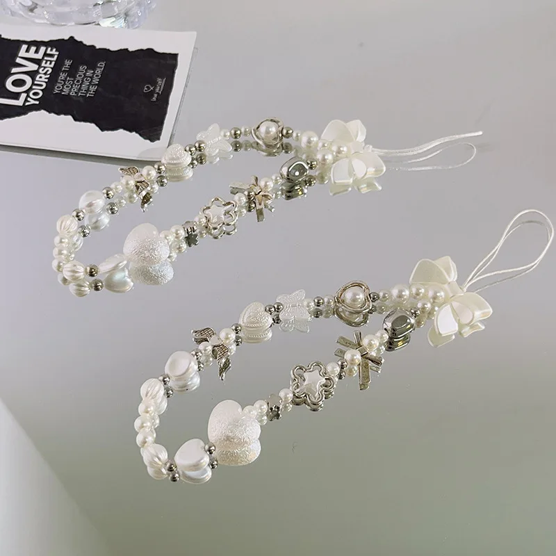 Cadena de teléfono con cuentas de flores y lazo blanco, cordón de lujo, colgante de joyería Universal para IPhone, accesorios para Samsung
