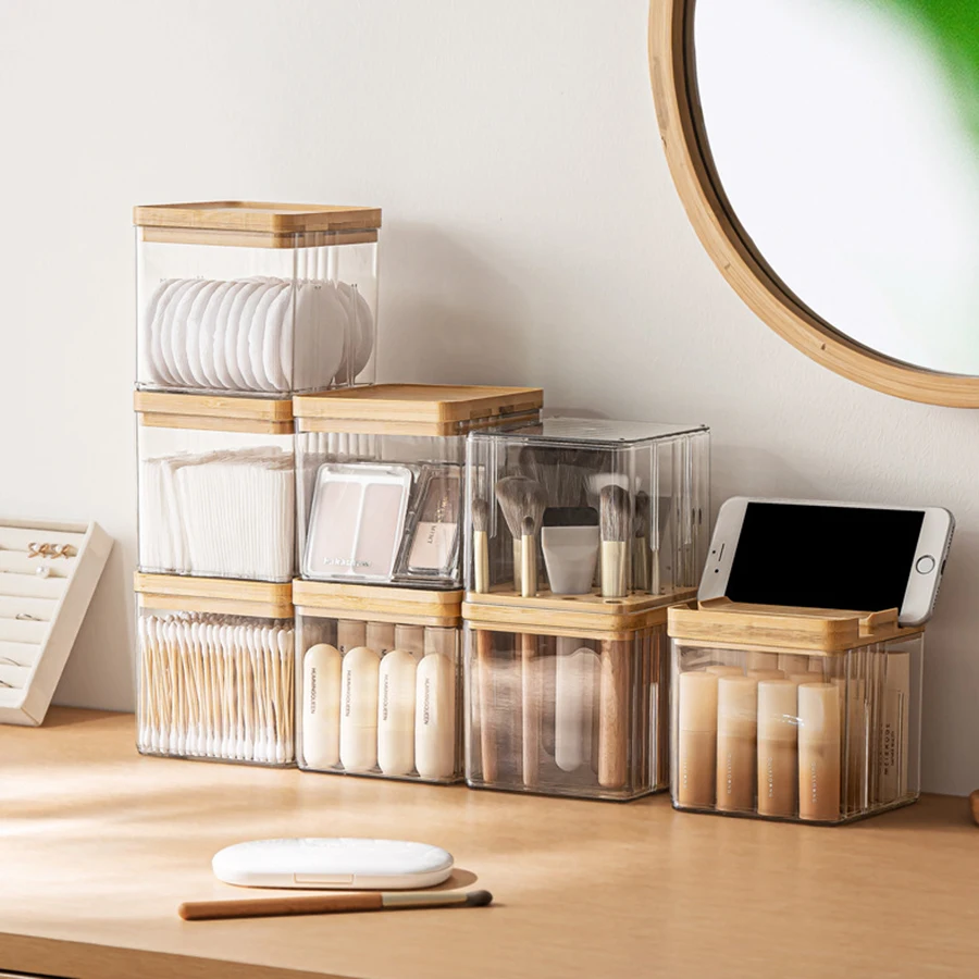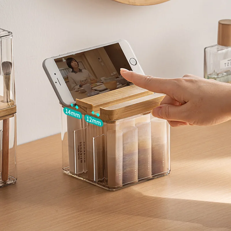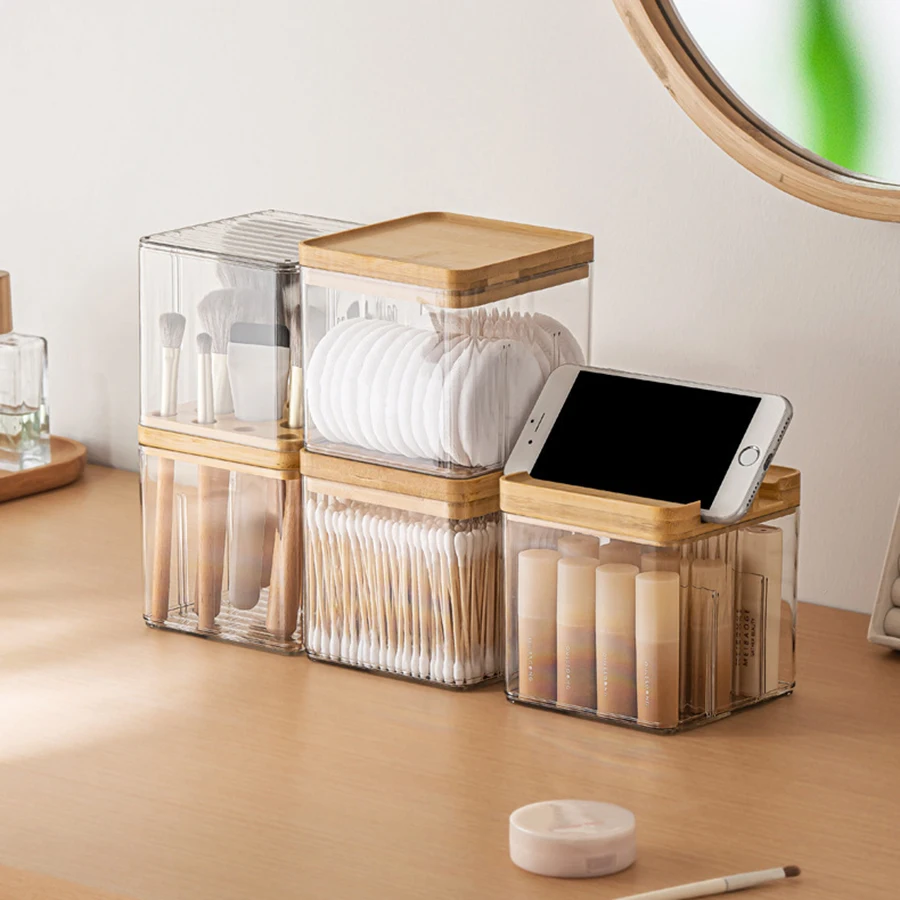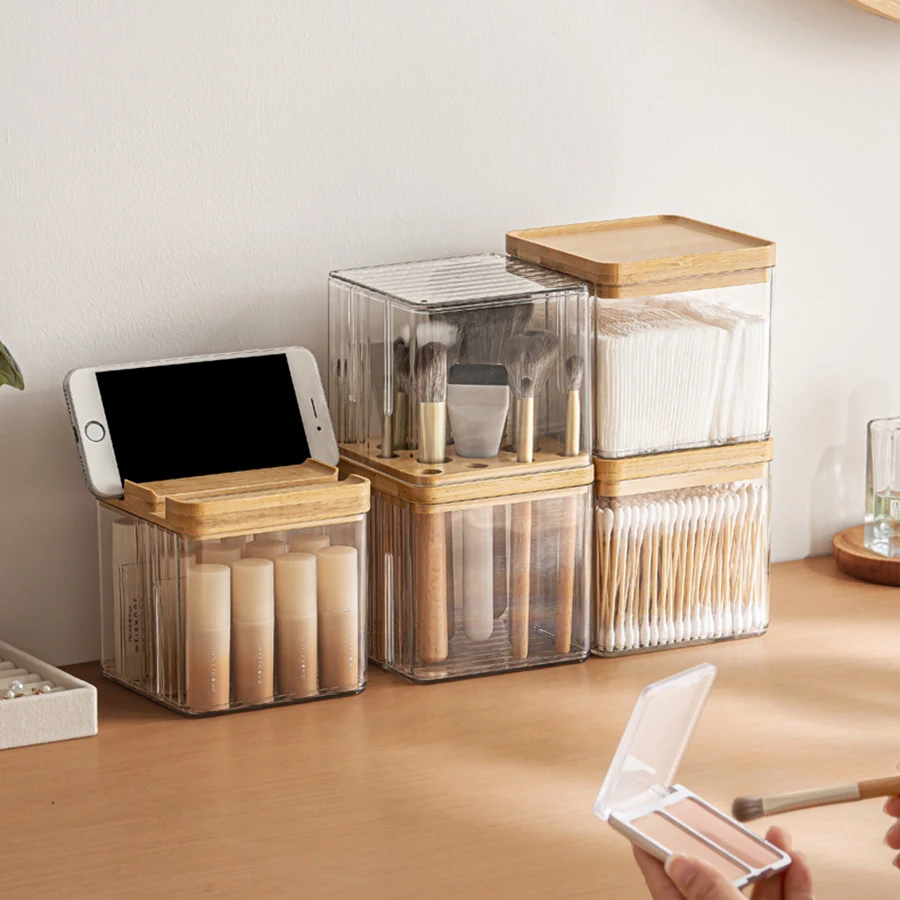 Comprar Caja de almacenamiento de cosméticos a prueba de polvo con cubierta para brochas de maquillaje de escritorio, hisopos de algodón, muestras de lápiz labial, organizador de productos para el cuidado de la piel