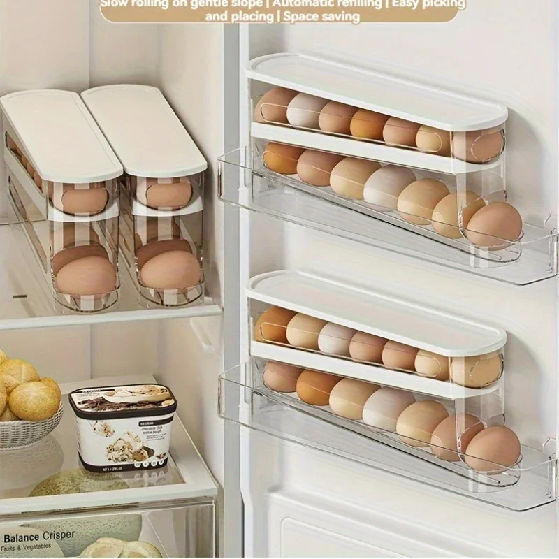 Caja de almacenamiento de huevos rodantes, refrigerador de estilo deslizante, puerta lateral para ahorrar espacio, una cocina de plástico duradera imprescindible