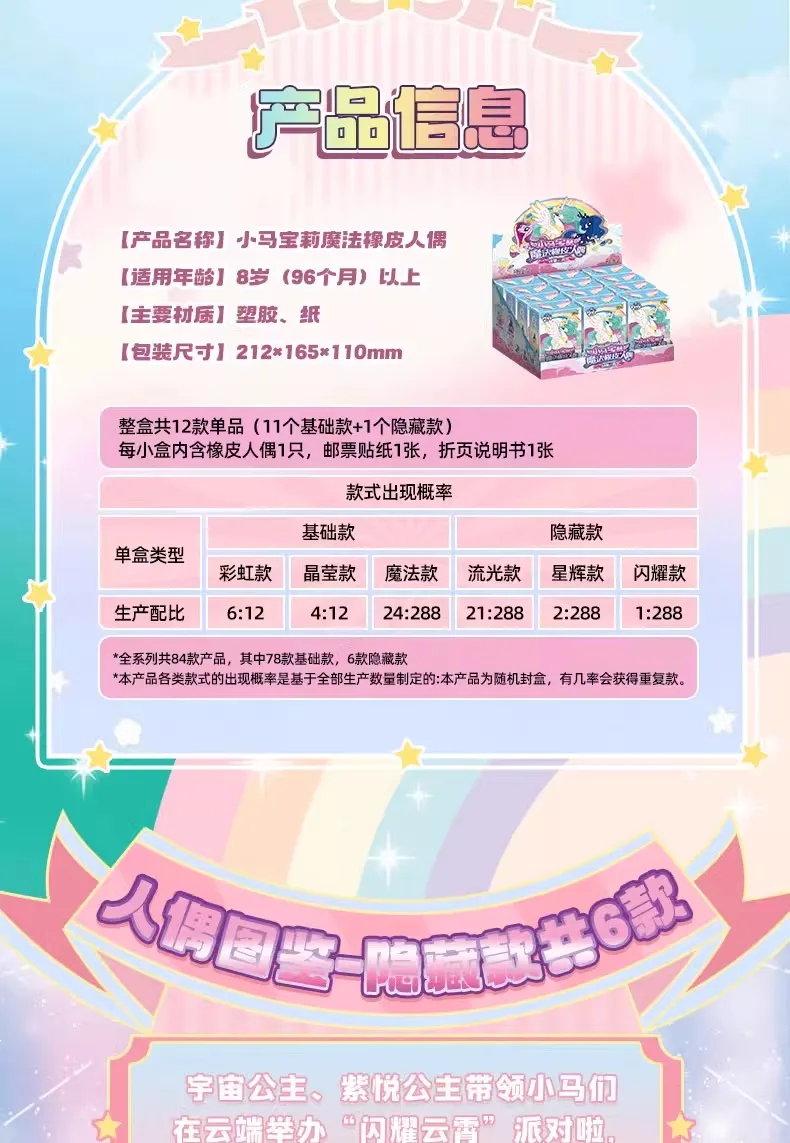 Toda la caja contiene 12 artículos (11 artículos básicos+1 artículo oculto). Cada caja pequeña contiene 1 muñeca de goma, 1 pegatina de sello y 1 manual de instrucciones plegable.