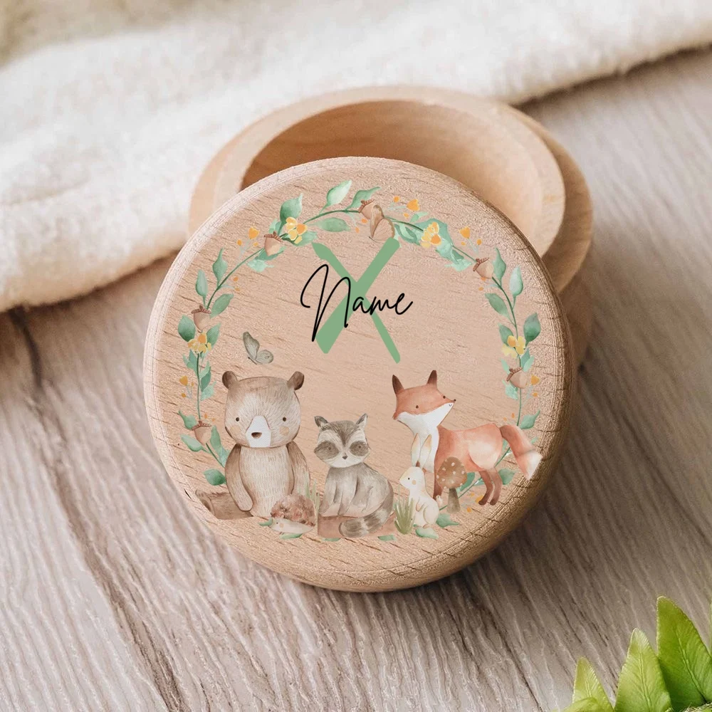 Caja de dientes personalizada con animales salvajes, nombre personalizado, dientes de recuerdo, cordón Umbilical, pelo rizado, caja de colección de madera para niños, regalos para niños