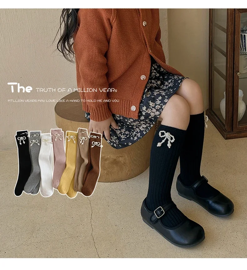 Calcetín de pantorrilla con diseño de princesa dulce para niña, bonito calcetín con lazo de perlas para niños, calcetín escolar de algodón suave para primavera y otoño