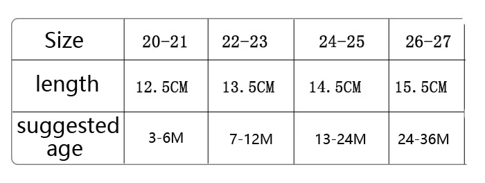 4 tallas: 20-21 (12,5 cm) adecuado para bebés de 3-6M,