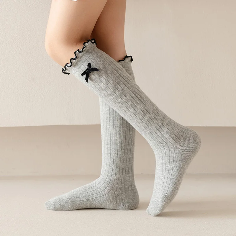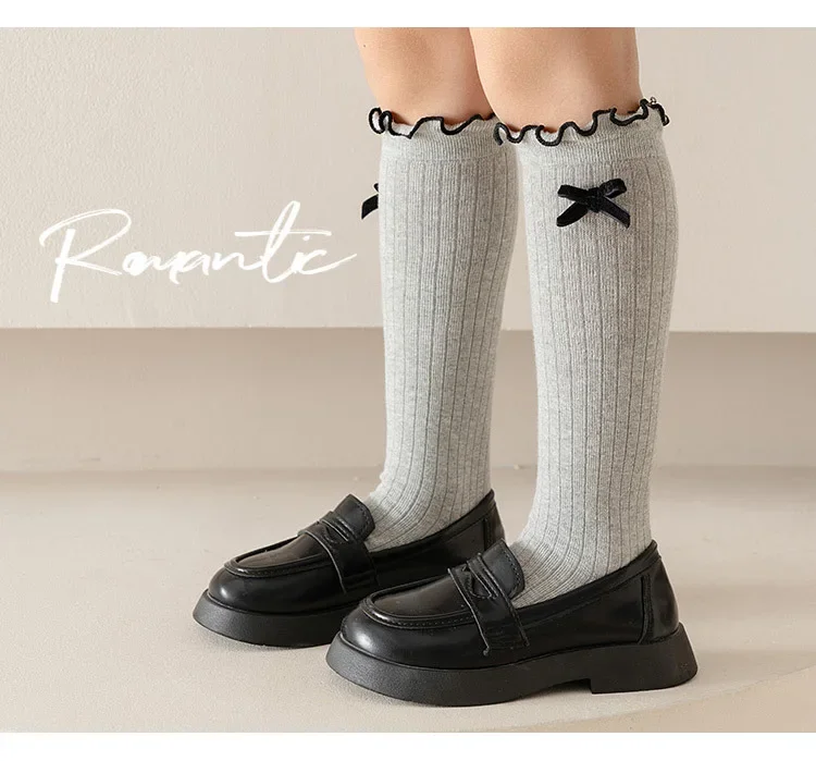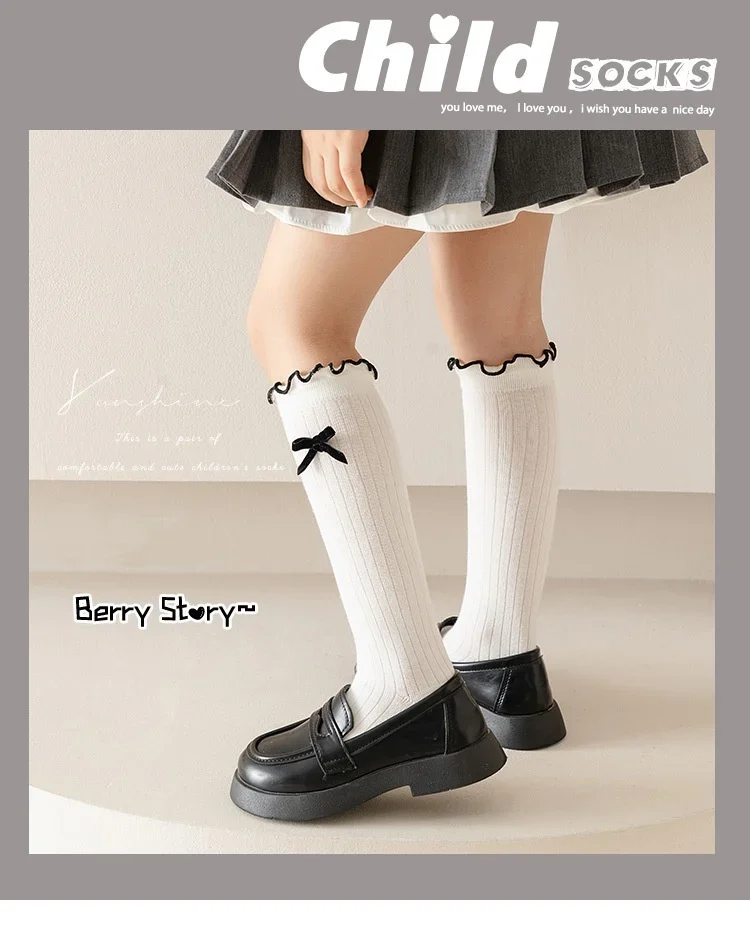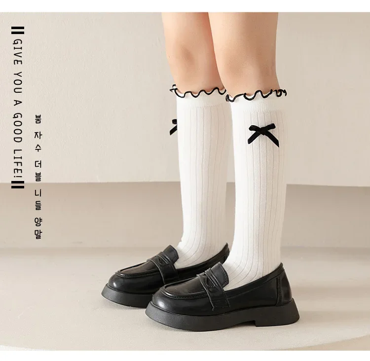 Calcetines coreanos con volantes y lazo hasta la pantorrilla para niñas, bonitos calcetines blancos hasta la rodilla de encaje largo para niños, medias escolares suaves para primavera y verano