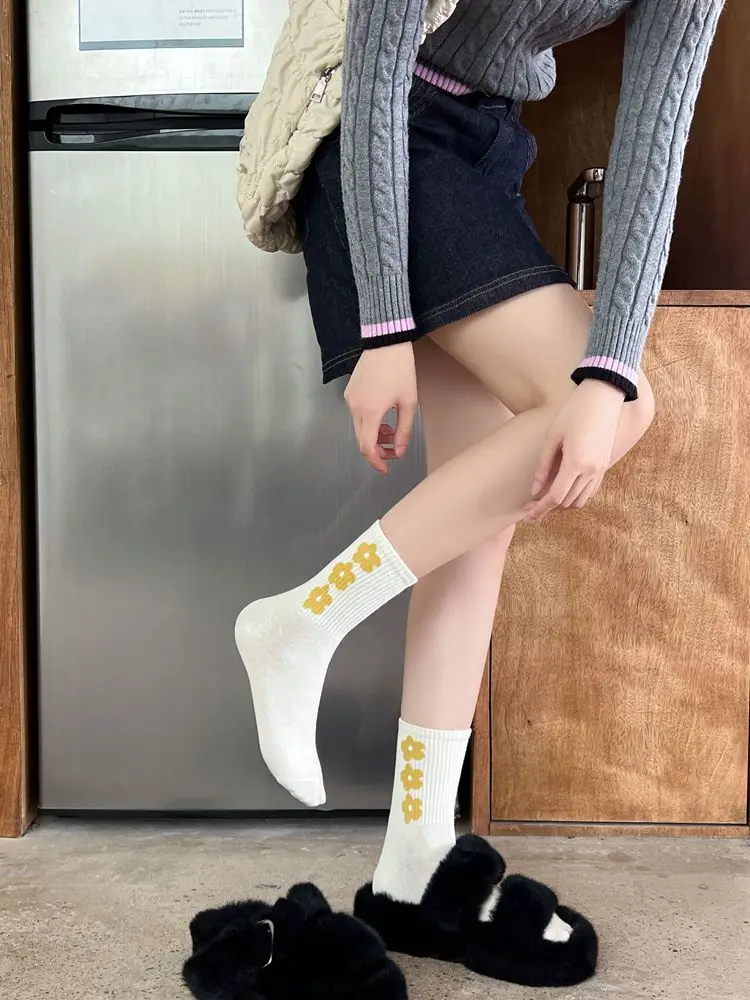 Comprar Calcetines largos elásticos de algodón con estampado Floral para niña, medias largas de punto Harajuku, estilo informal, Hip Hop, monopatín, color blanco y negro