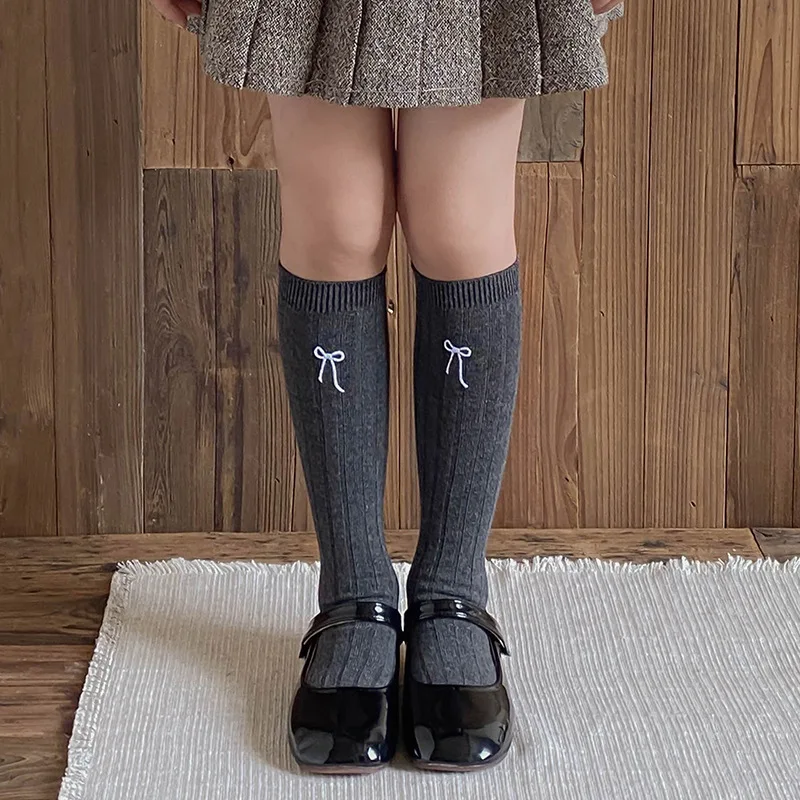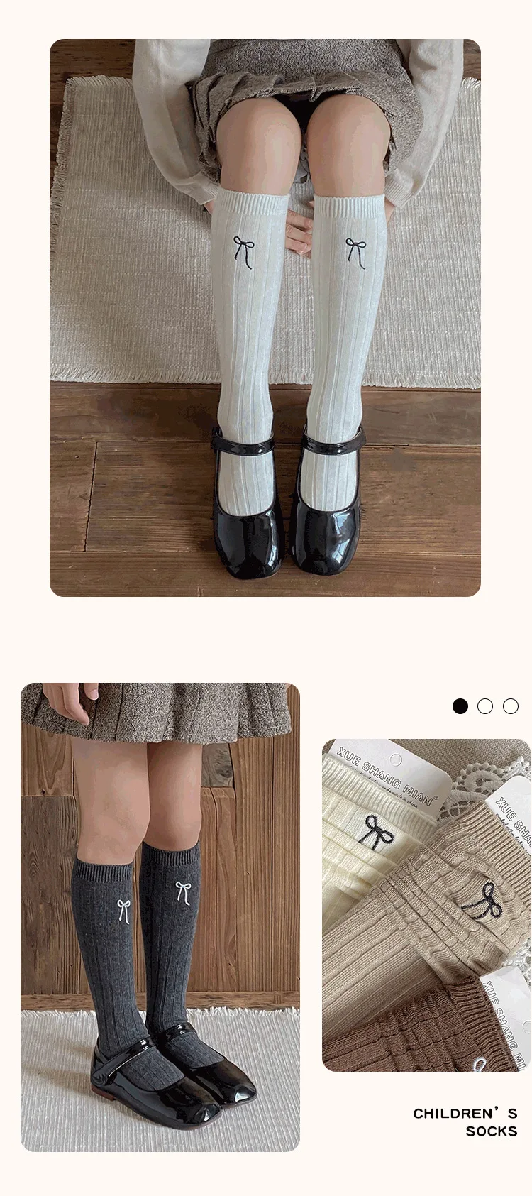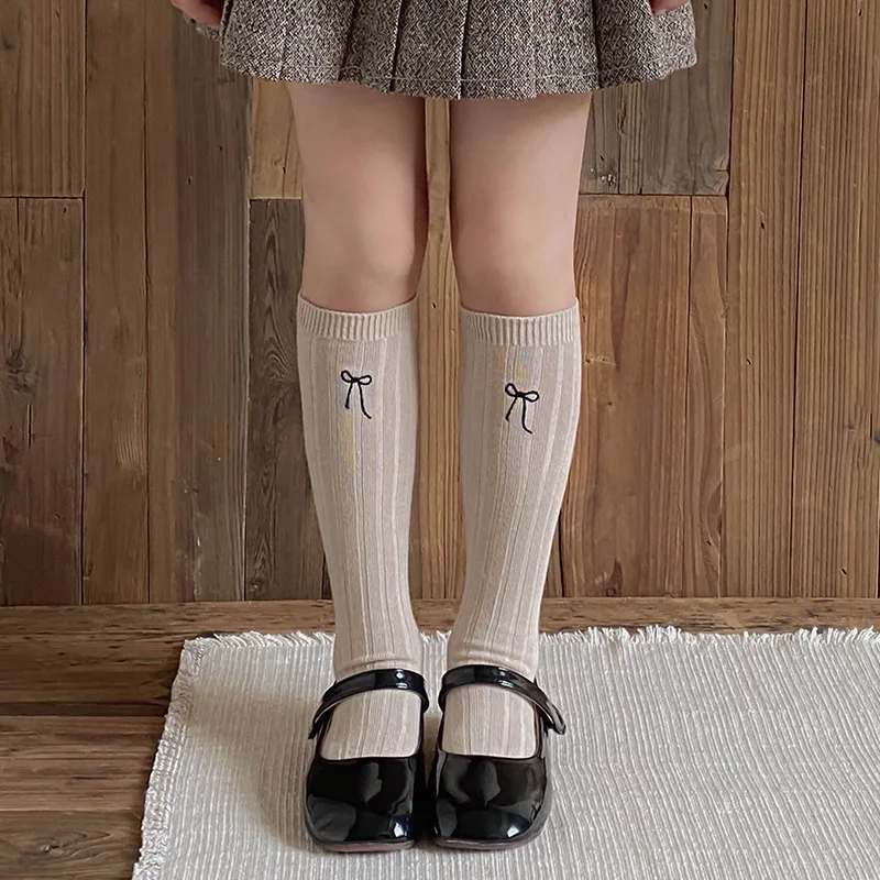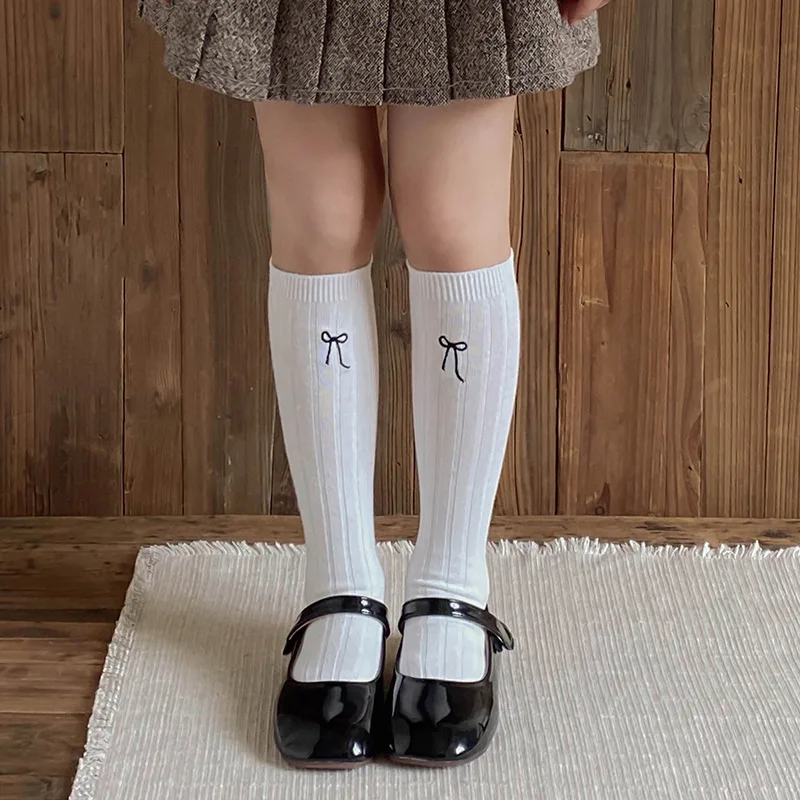 Calcetines largos para niñas, medias con lazo bordado para primavera y otoño, calcetines coreanos de algodón de tubo largo de punto liso para niñas de Lolita