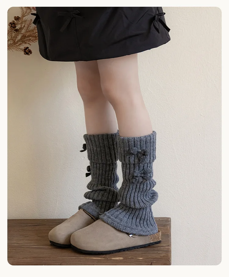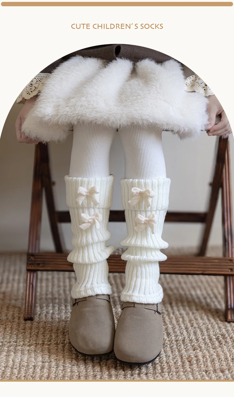 Calcetines hasta la rodilla para niñas, calentadores de piernas de punto cálidos para invierno, calcetines apilados con puños de lazo para niñas pequeñas, calcetines bonitos coreanos Kawaii marrones para botas