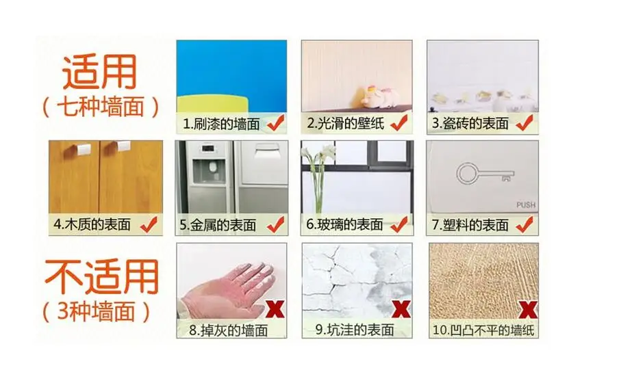 Adecuado para 7 tipos de paredes: 1.Paredes pintadas, 2.Fondos de pantalla lisos, 3.Paredes de azulejos lisas, 4.Superficies de madera lisas, 5.Superficies metálicas lisas, 6.Superficies de vidrio lisas, 7.Superficies de plástico lisas