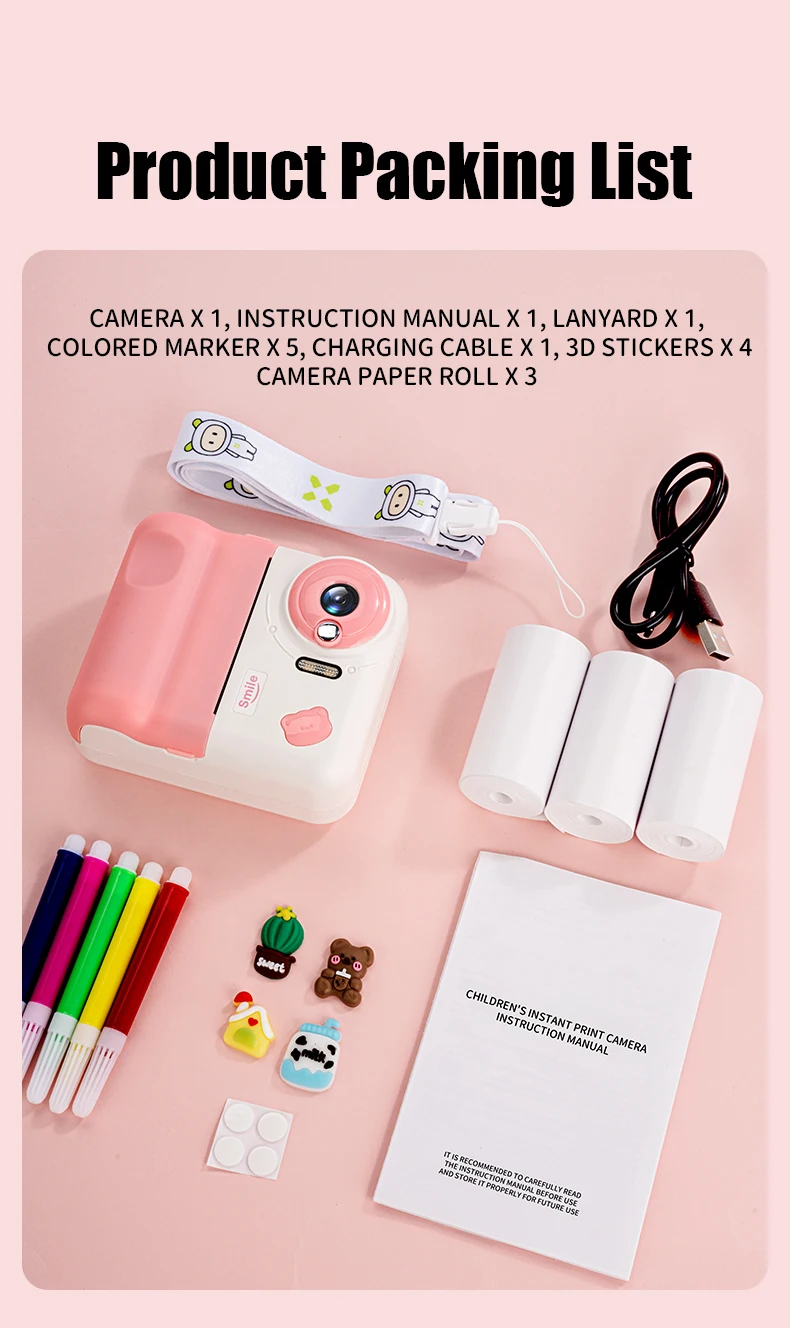 Cámara*1, Manual*1, Cordón*1, Bolígrafo de color*5, Cable de carga*1, Pegatinas estéreo*4, Rollo de papel para cámara*3