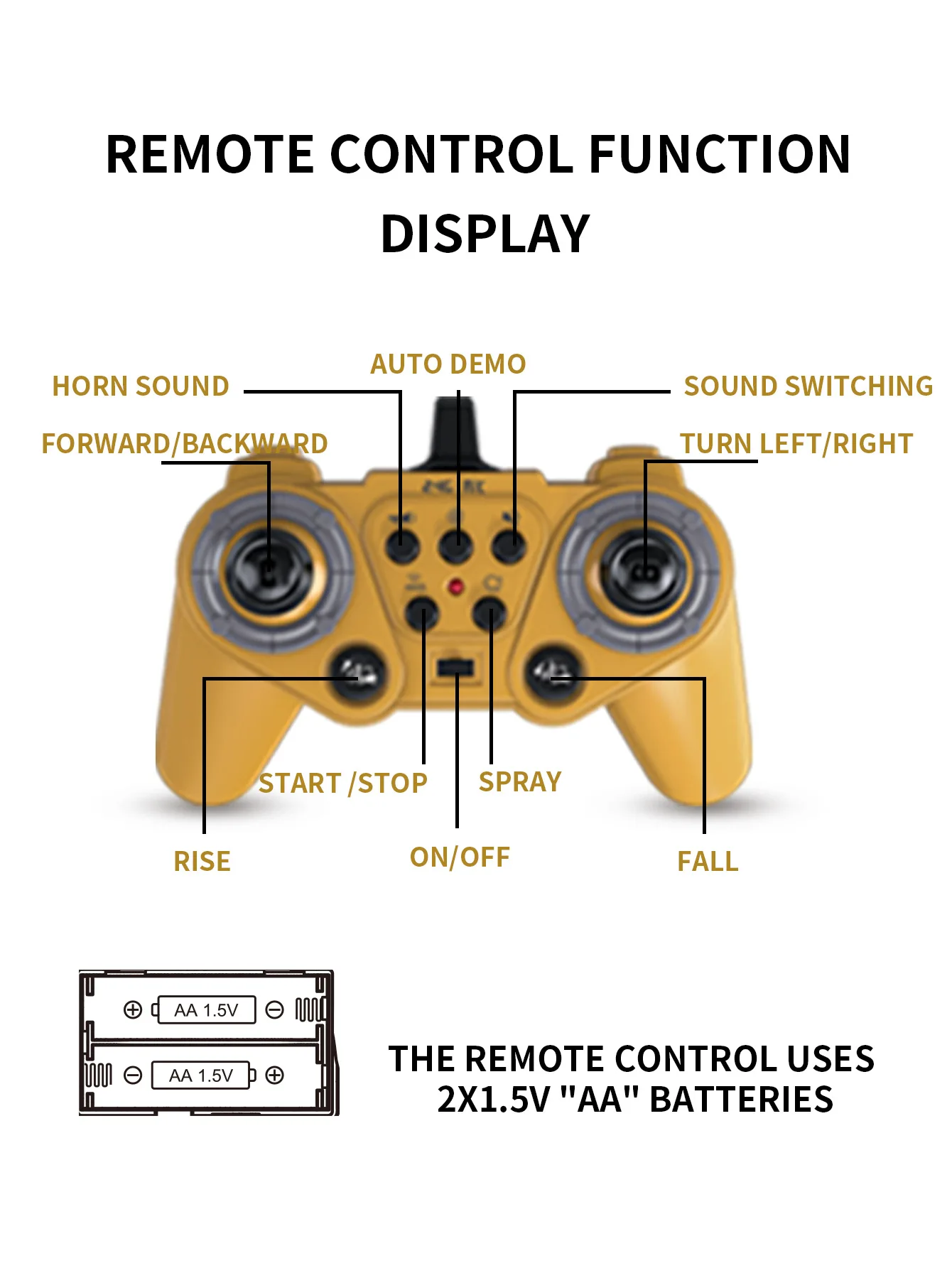 El automóvil puede avanzar y retroceder, girar a la izquierda y a la derecha, levantar y bajar, iluminar, música, rociar, sonar la bocina, arrancar, detener, controlar el sonido, demostración automática y la cabeza y el carro se pueden desmontar manualmente.