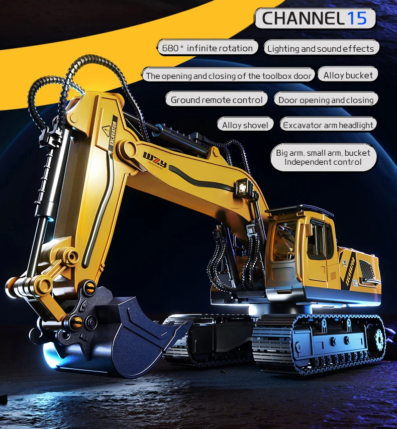 【Niños 15 canales】 Luces, música, adelante, atrás, giro a la izquierda, giro a la derecha, rotación a la izquierda y a la derecha en el lugar, excavación hacia adelante independiente del brazo, empuje inverso independiente del brazo, giro a la izquierda del puente, giro a la derecha del puente, demostración con 1 clic, brazo pequeño subiendo, brazo pequeño caendo, excavación hacia adelante del cucharón, empuje inverso del cucharón